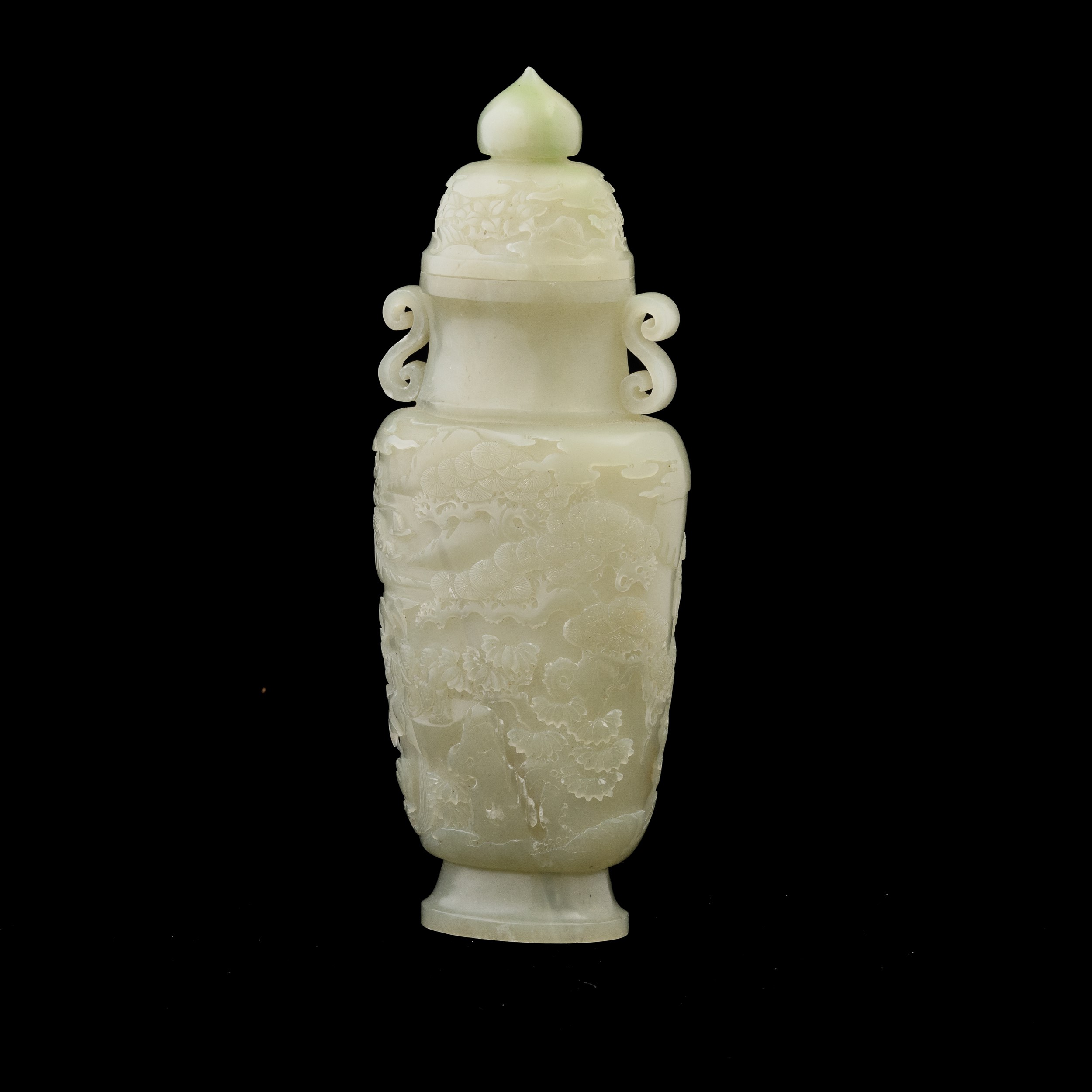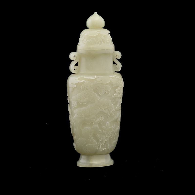 Vaso con coperchio scolpito in giada bianca Celadon con decoro di paesaggio, Cina, Repubblica, XX secolo