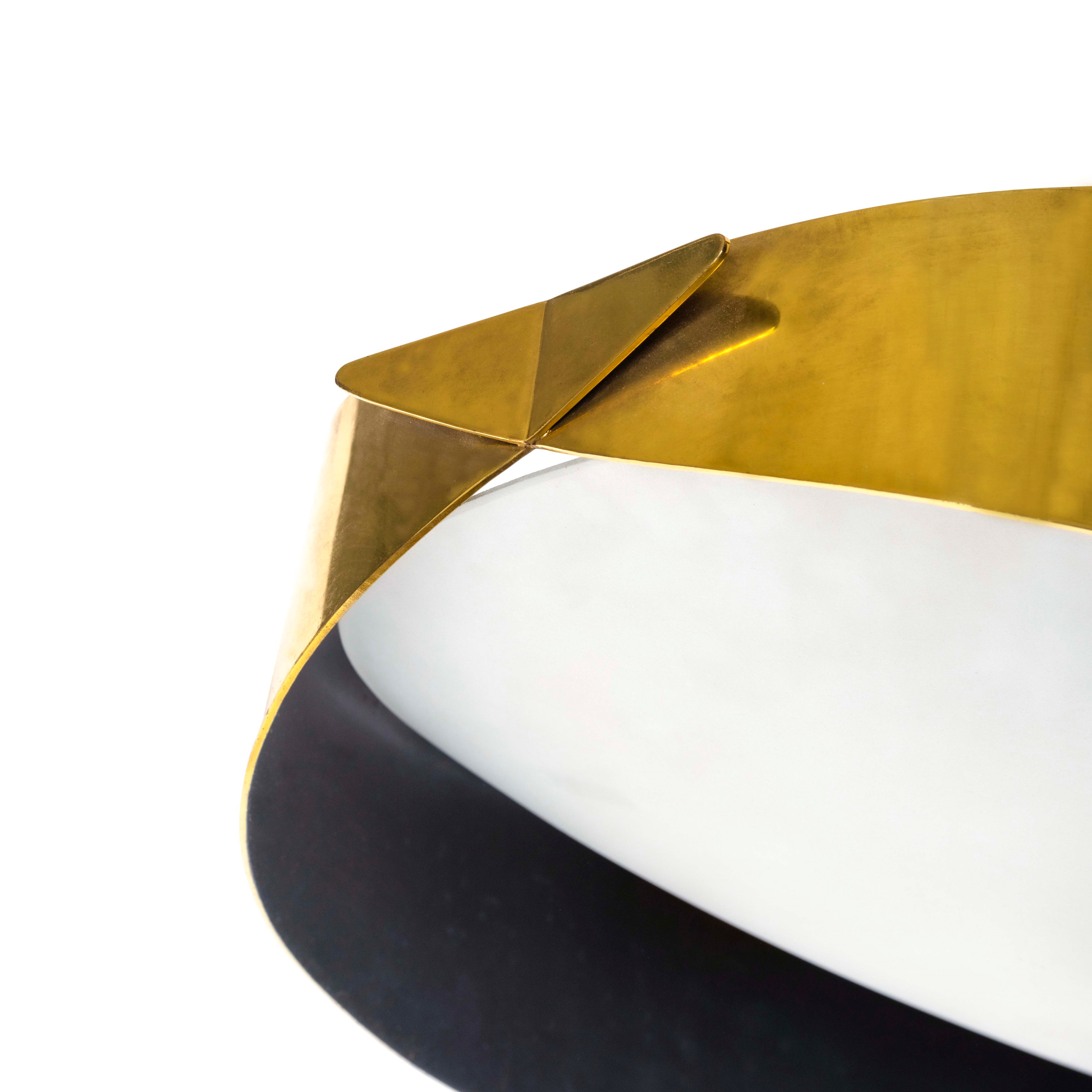 Struttura in ottone e diffusore in cristallo curvato satinato.