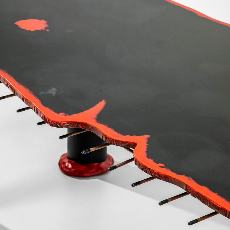 per colata in resina epossidica colorata. Sostegni con anima in metallo, piede in poliuretano semirigido e rivestimento esterno in PVC.