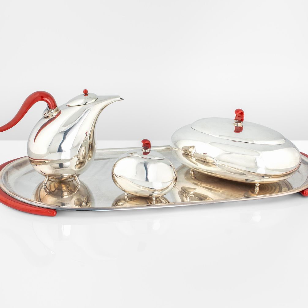 Set composto da un vassoio con zuccheriera, biscottiera e teiera. Argento 925 e bachelite colorata. Firma originale.