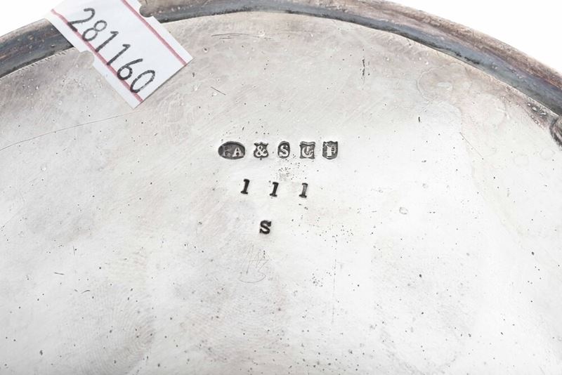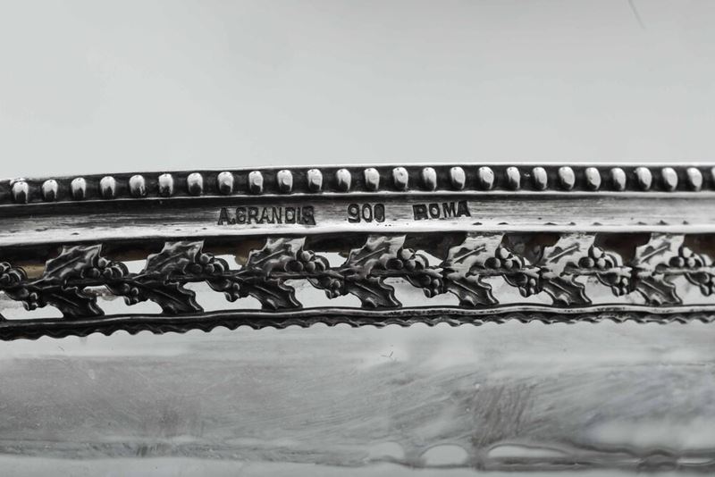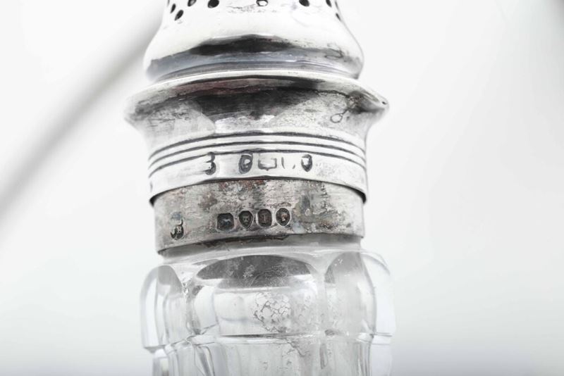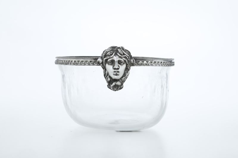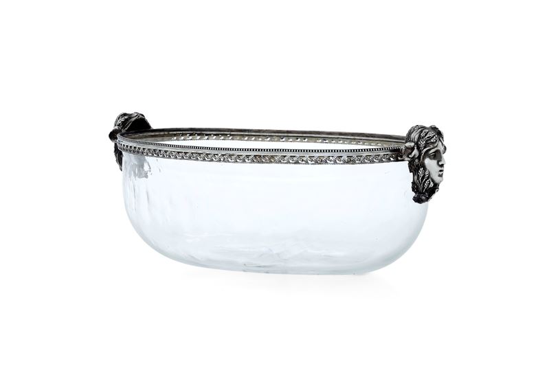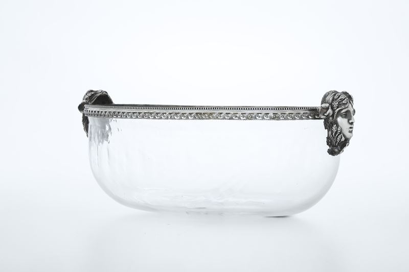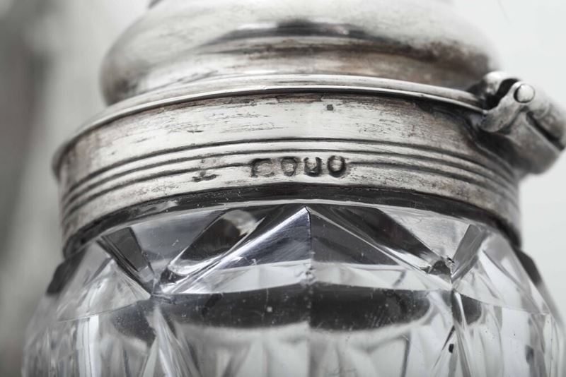Del lotto fanno parte una cruet di metallo argentato XX secolo e una ciotola in vetro e argento, Italia, A.Degrandis, Roma XX secolo.