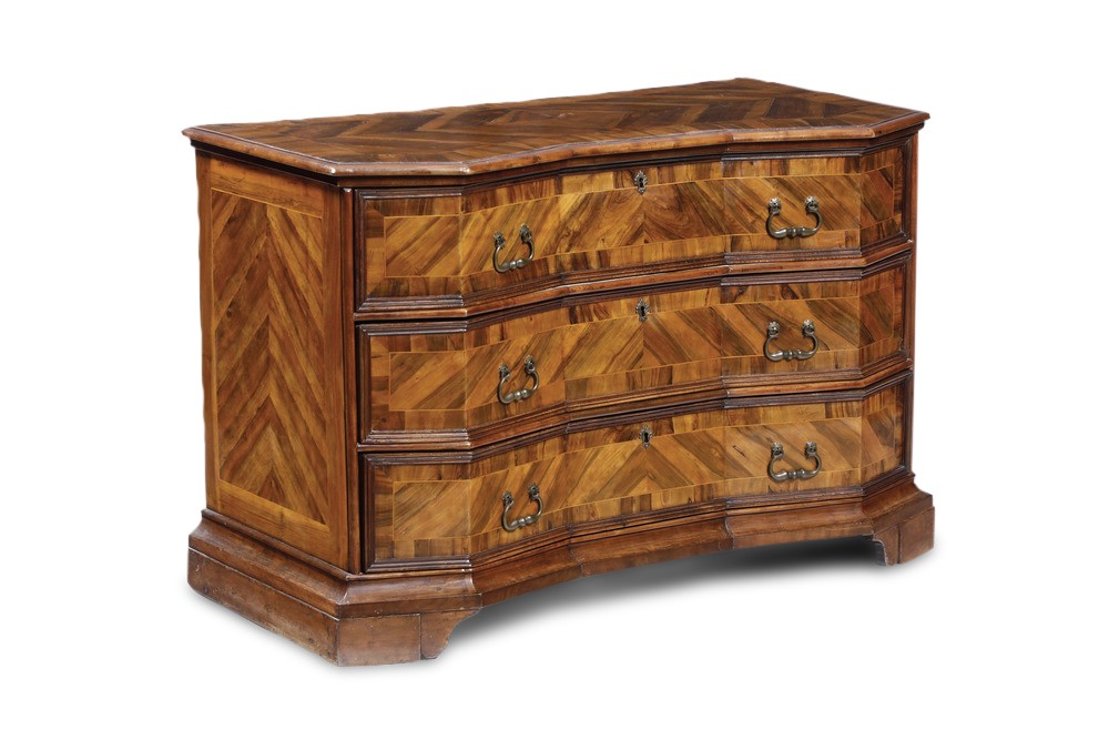 Cassettone con fronte spezzato lastronato in ulivo e filettato. Lombardia XVIII secolo