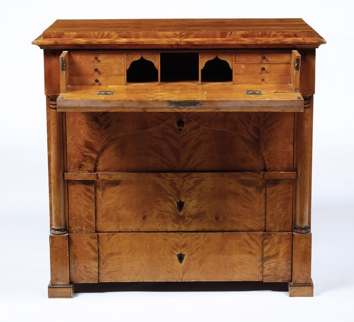 tre casssetti alla base, cassetto superiore celante scrittoio con cassettini e vani portadocumenti