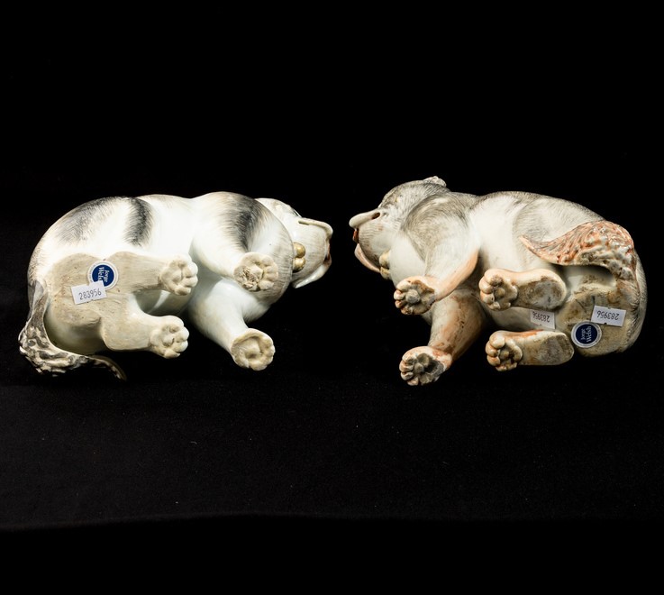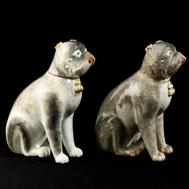 Coppia di cani carlini in porcellana decorati in smalti policromi e oro, Cina, Dinastia Qing, epoca Qianlong (1736-1795)