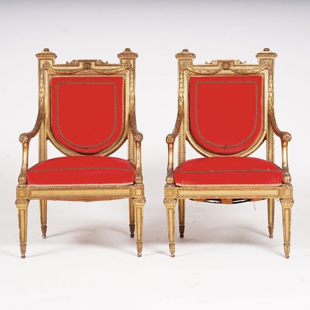 Coppia di poltrone in legno intagliato e dorato. XVIII-XIX secolo