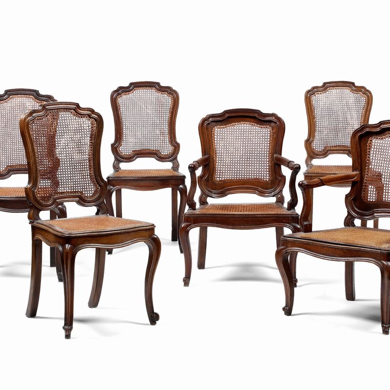 Divano, quattro sedie e due poltrone in noce intagliato. XIX secolo