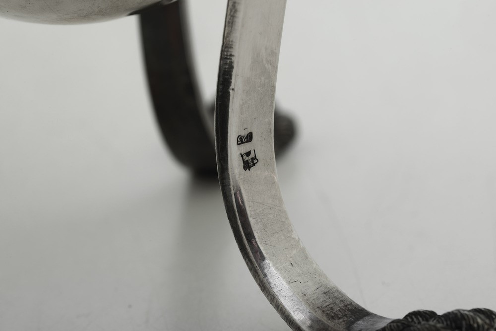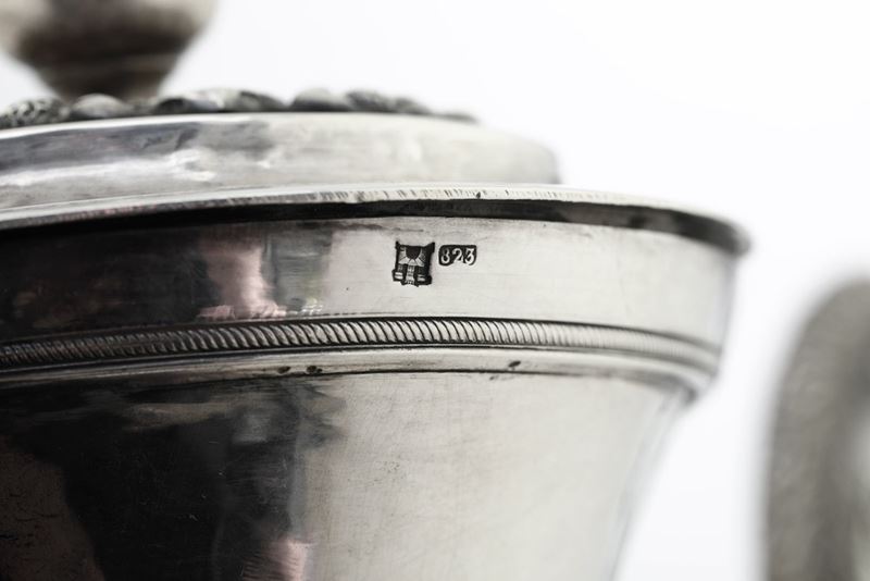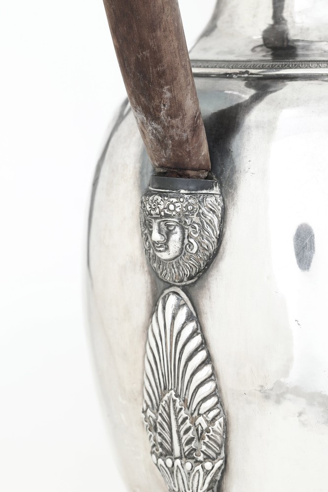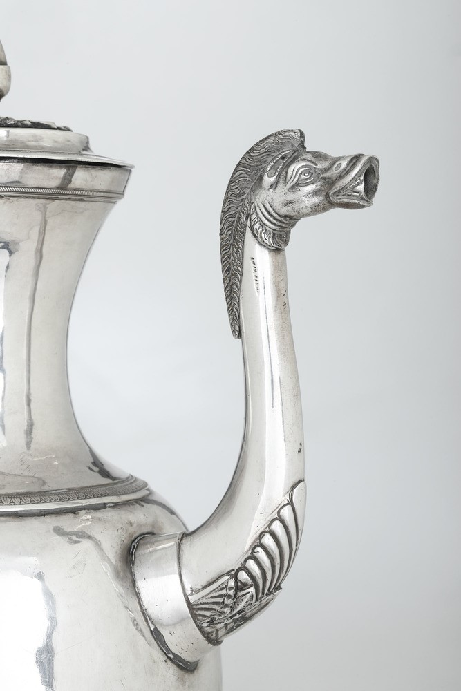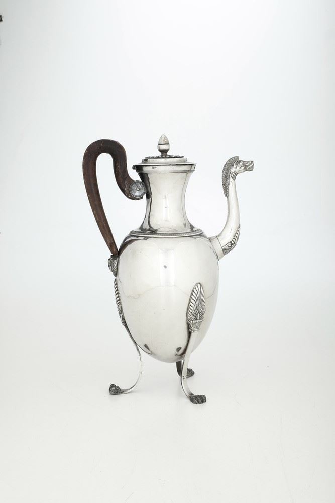 Rara caffettiera dalle inusuali dimensioni tra le più grandi documentate nella produzione neoclassica genovese del XIX secolo. Corpo ovoidale sorretto da sostegni a tripode a foggia di zampa ferine, alto versatoio con beccuccio raffigurante testa di cavallo e presa del coperchio a ghianda