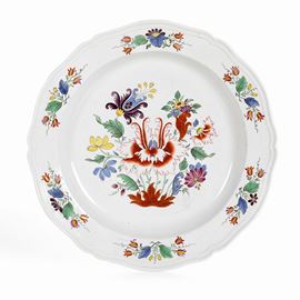 Piatto sagomato e cordonato decorato con uno dei più famosi motivi della manifattura detto “al tulipano” che ebbe grande successo sotto la direzione di Lorenzo Ginori. La decorazione presenta al centro una grande peonia aperta ispirata dalle porcellane cinesi della “famiglia rosa”