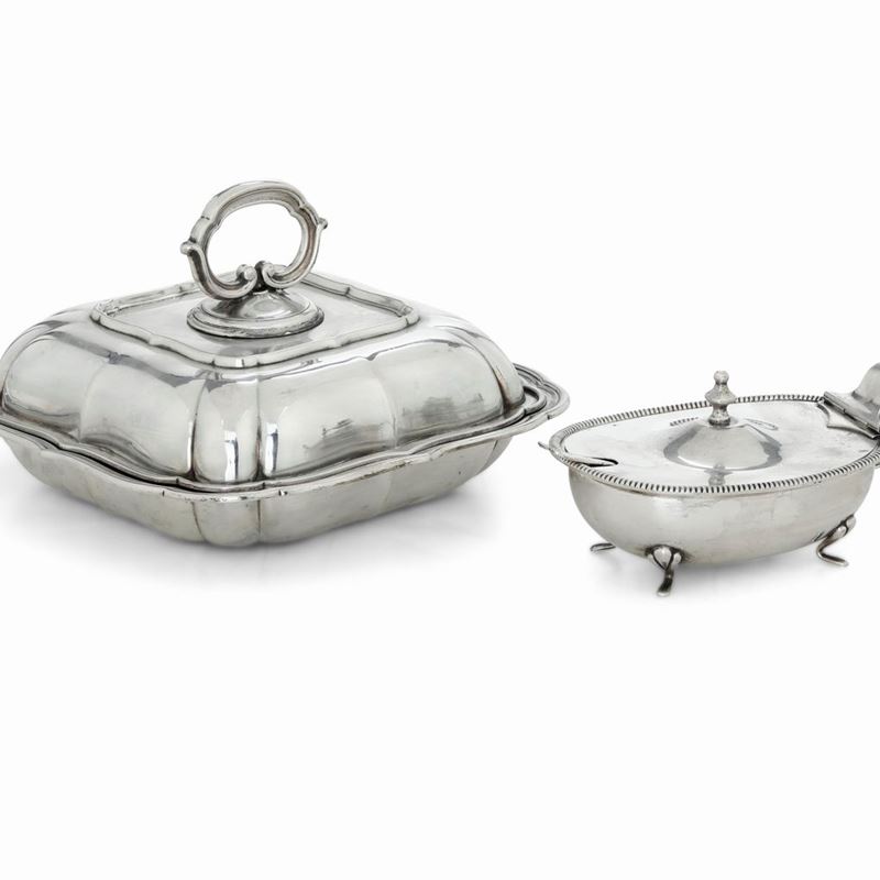 Legumiera e portaformaggio. Italia XX secolo. Legumiera argentiere Ricci & C , Alessandria. Portaformaggio argentiere Puliti & Schreyer, Firenze