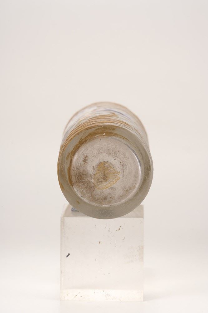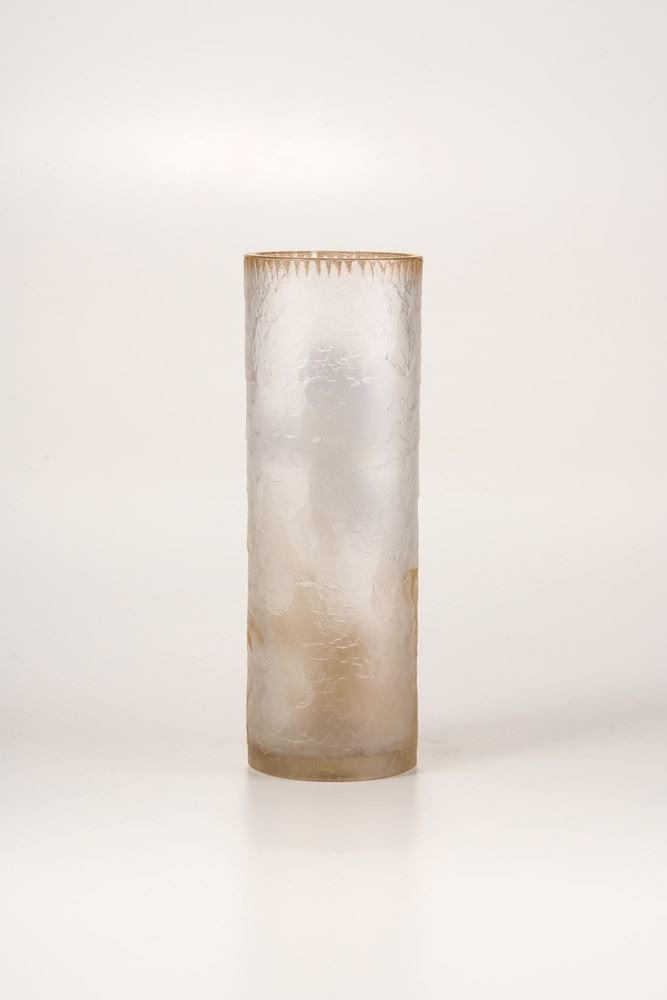 Vaso cilindrico con superficie martellata e decoro di ireos a smalti policromi. Bocca con decoro in oro.