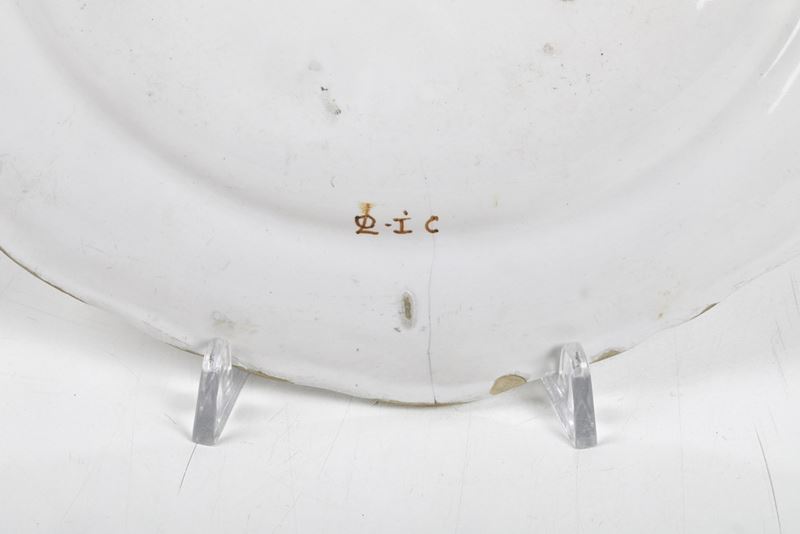 Maiolica policroma a gran fuoco. Marca: "OL" e iniziali del pittore "IC", in ocra. Diametro: cm 25,4. Conservazione: qualche salto di smalto al bordo