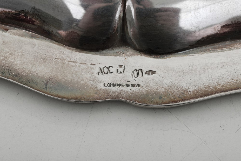 Piatto da portata. Argenteria italiana. Marchi con fascio littorio in uso dal 1935 al 1945. Argentiere Cesa, Alessandria per gioielleria Chiappe, Genova