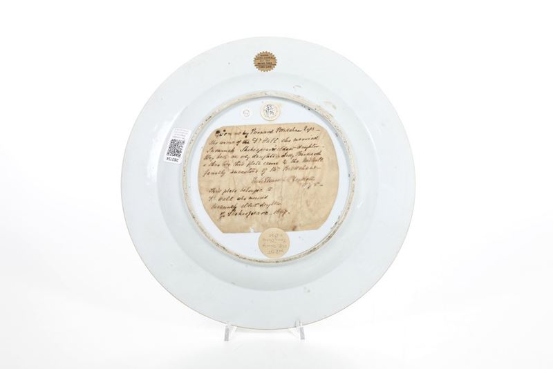 Piatto in porcellana stemmato con lumeggiatura in oro e stemma nobiliare policromo con due grifoni al centro del cavetto, Cina, XVIII secolo