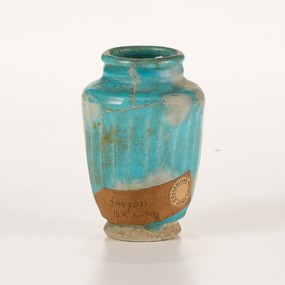 Ceramica artificiale (“fritta”). Altezza cm 11,5. Conservazione: rotto in diversi frammenti e ricomposto in restauro. Provenienza: collezione Luigi Laura, ome da etichetta cartacea