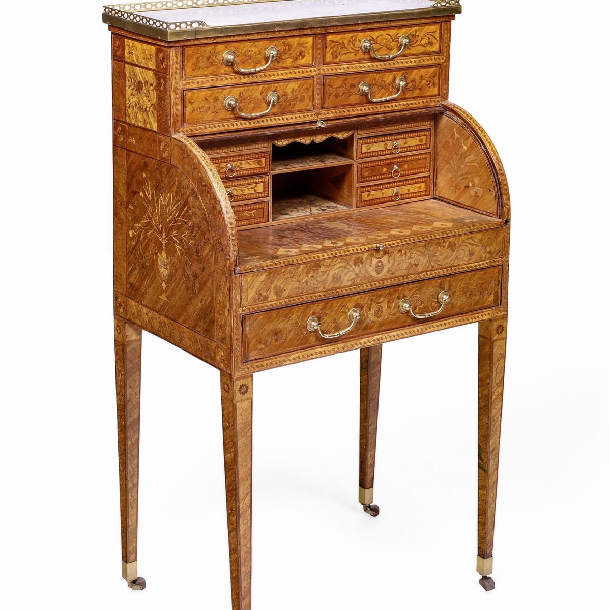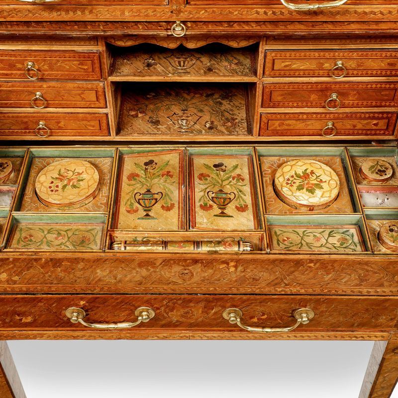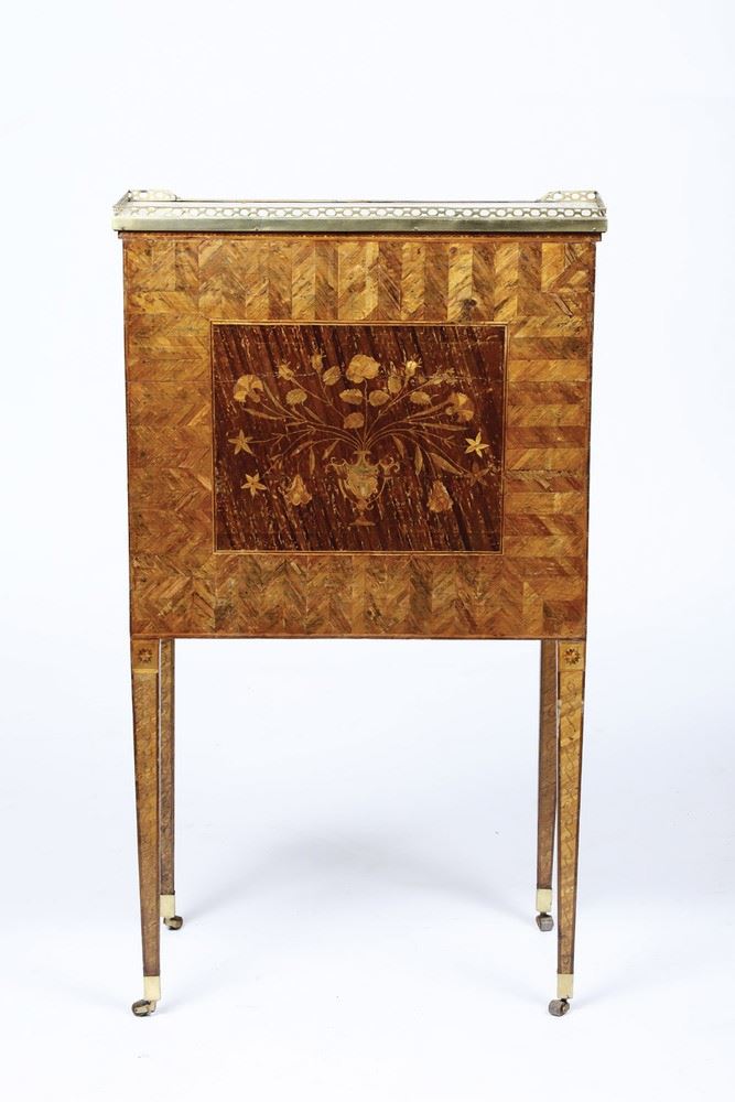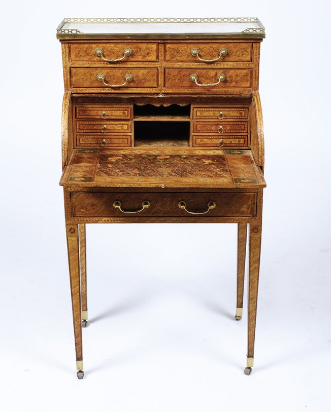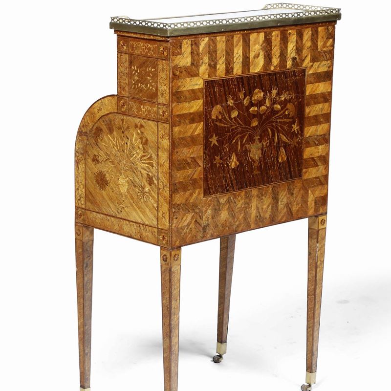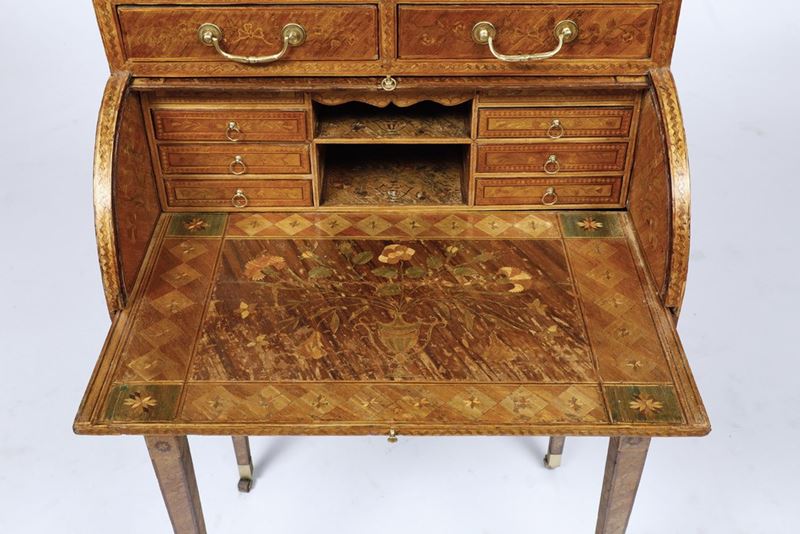 Raro scrittoio a rullo in legno lastronato ed intarsiato in paglia colorata. Francia XVIII secolo