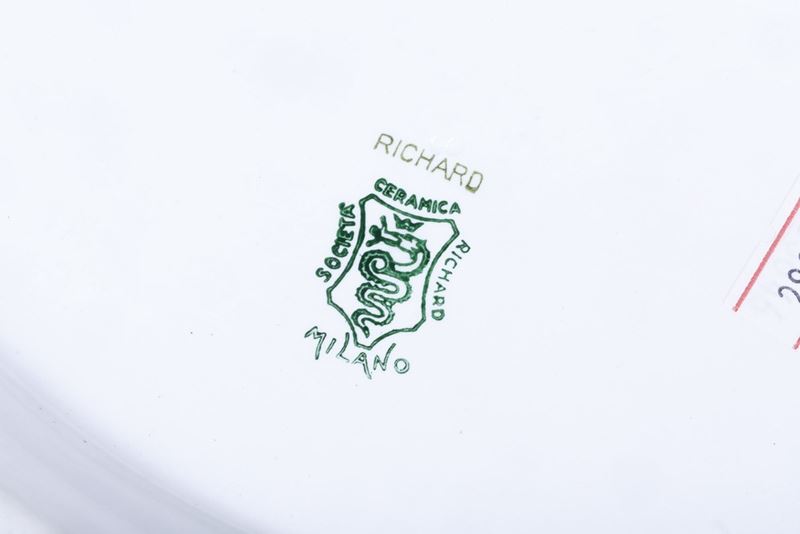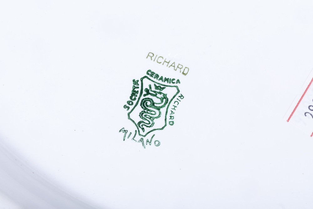Terraglia decorata in policromia. Marca: scudo con biscione e “Società Ceramica Richard Milano” in verde. Conservazione: ottima