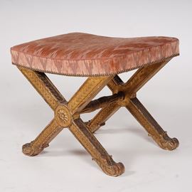 Sgabello Carlo X in legno intagliato e dorato, XIX secolo