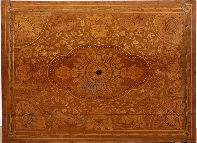 Tavolo da centro interamente lastronato ed intarsiato. XVIII-XIX secolo