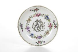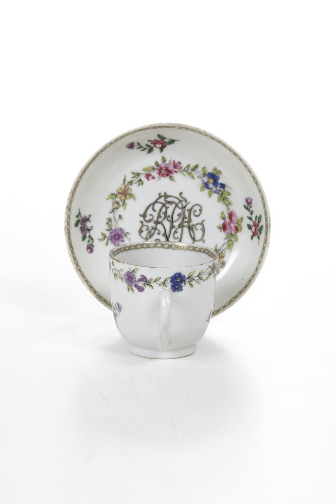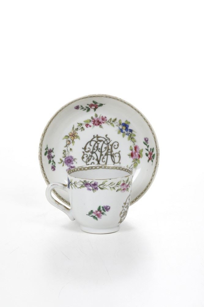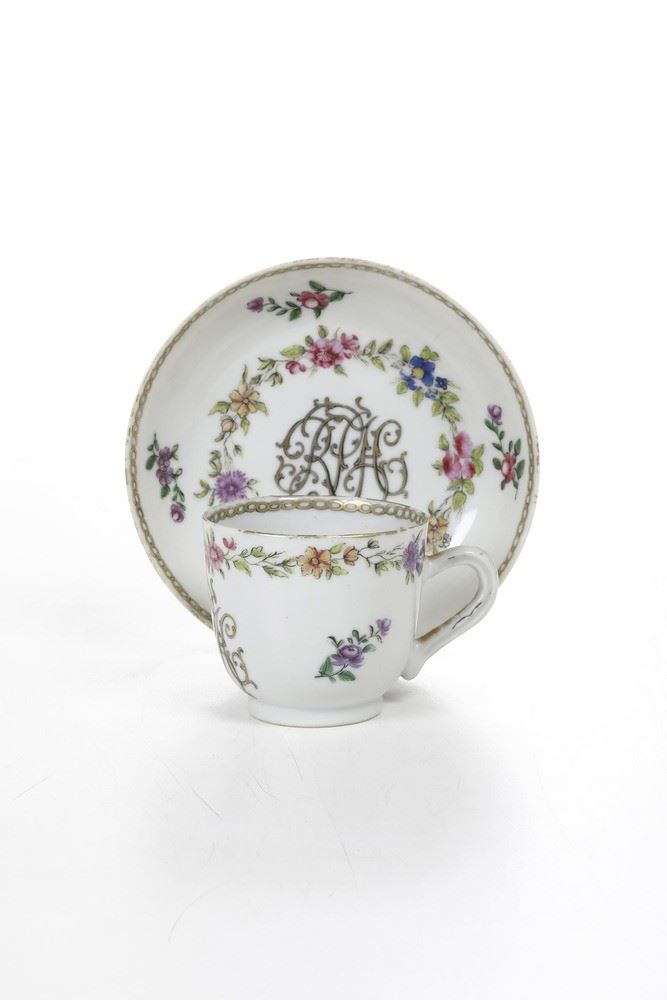 La tazza ed il piattino ospitano il monogramma "RPH" tracciato in oro, circondato da una ghirlanda e da ramoscelli fioriti policromi