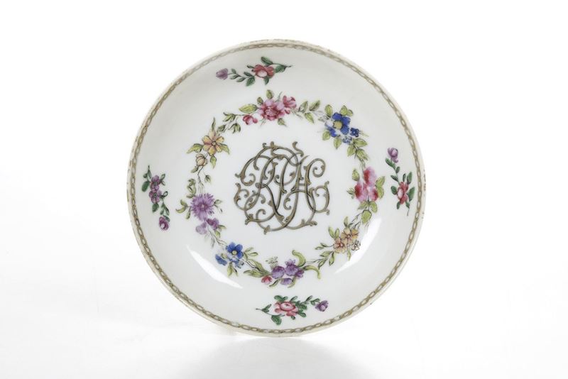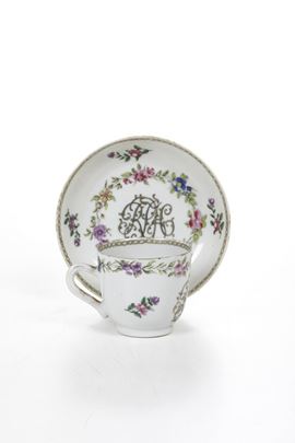 Porcellana policroma e dorata. Marca: assente. Dimensioni: altezza tazza cm 6; diametro piattino cm 12. Conservazione: buona; restauro al manico della tazza e insignificanti sbeccature e usure all’oro al bordo superiore; una insignificante felatura al piattino e usure all’oro del bordo