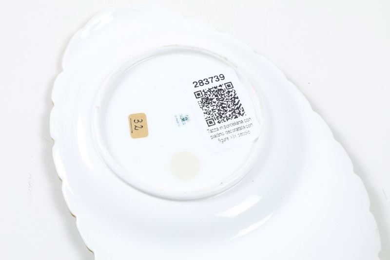 Dimensioni: altezza tazza cm 8,6; vassoietto cm 20,5x12,3. Conservazione: ottima; sbeccatura sul vassoietto all'anello di contenimento della tazza