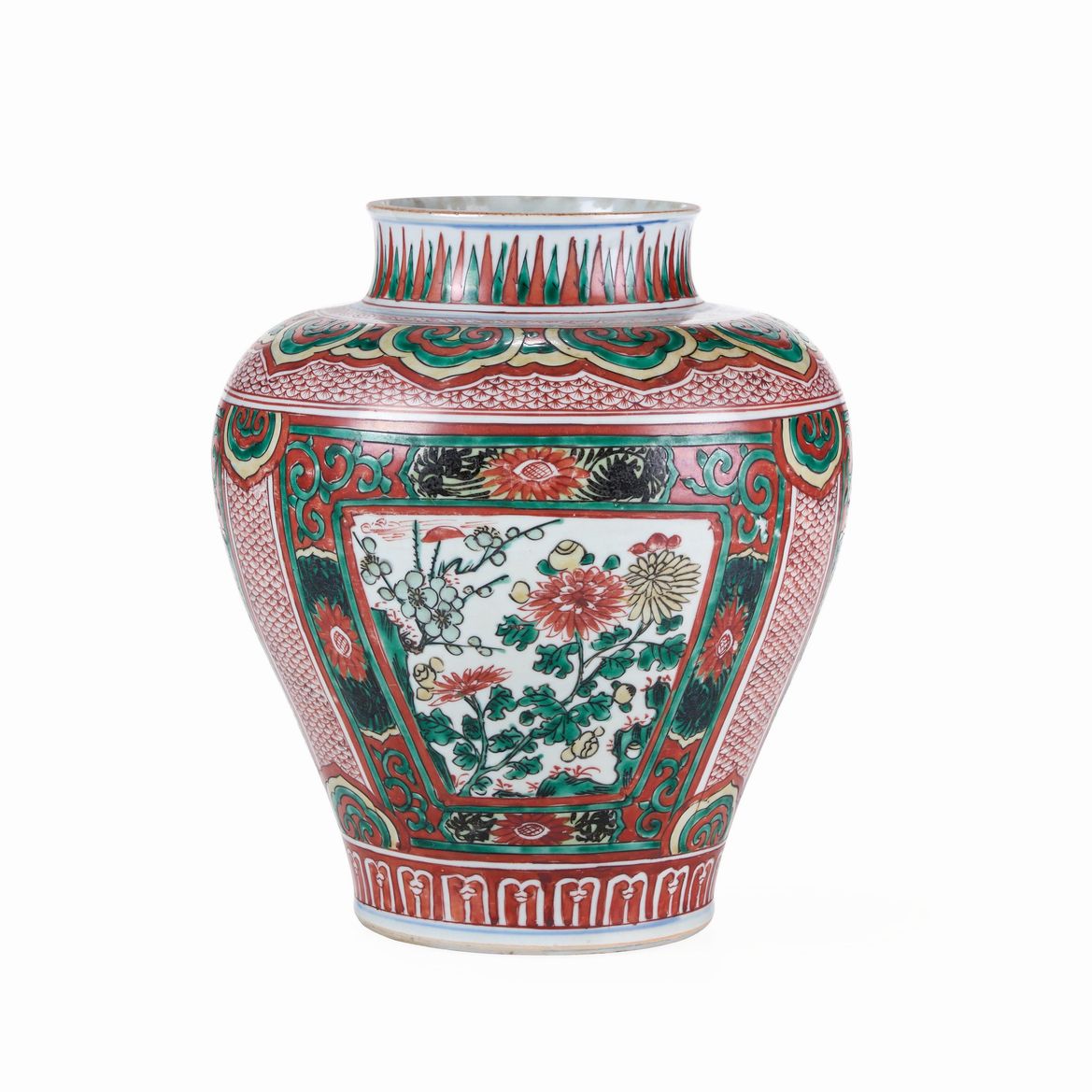 Vaso in porcellana con decori floreali e soggetti naturalistici entro riserve, Cina, Dinastia Qing, epoca Chongzheng (1628-1643)