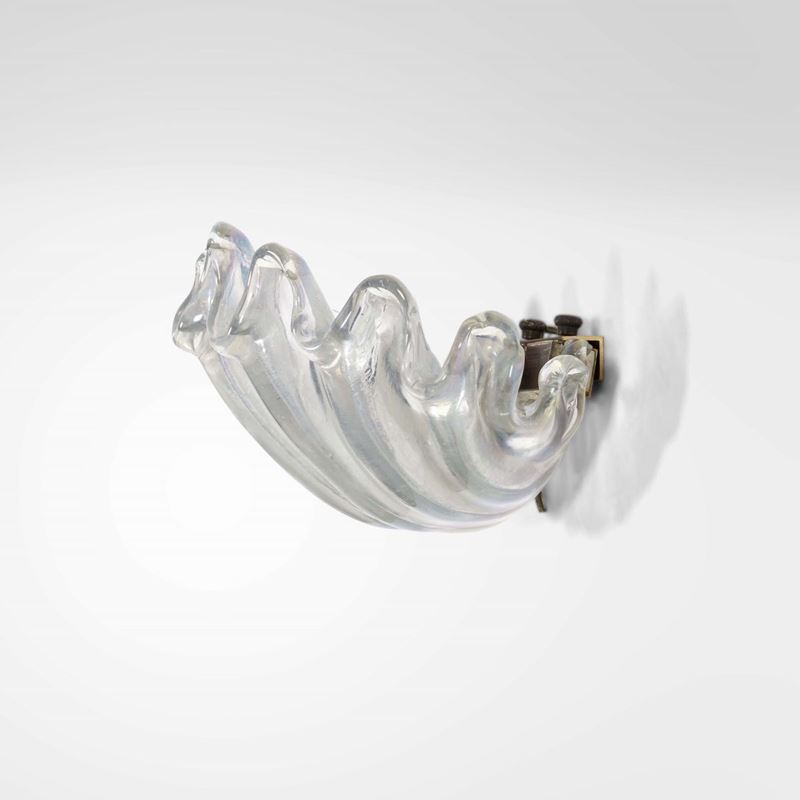 Struttura in vetro iridato pesante lavorato a grosse costolature. Sostegni in ottone.