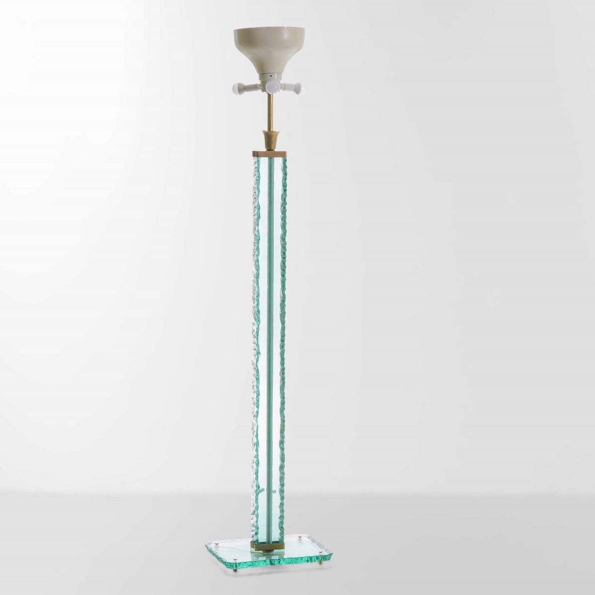 Struttura e base in cristallo di forte spessore scalpellato, particolari in ottone e metallo laccato.