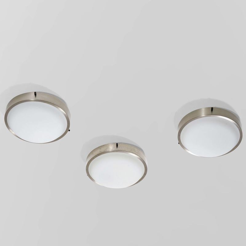 Struttura in metallo nichelato, metallo laccato e diffusori in vetro curvato satinato.