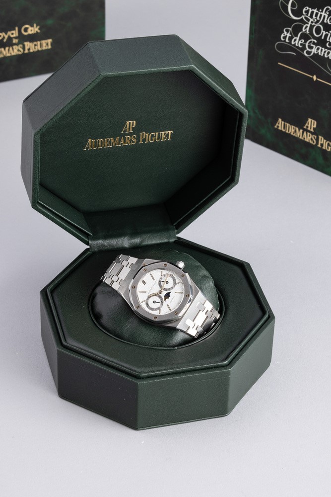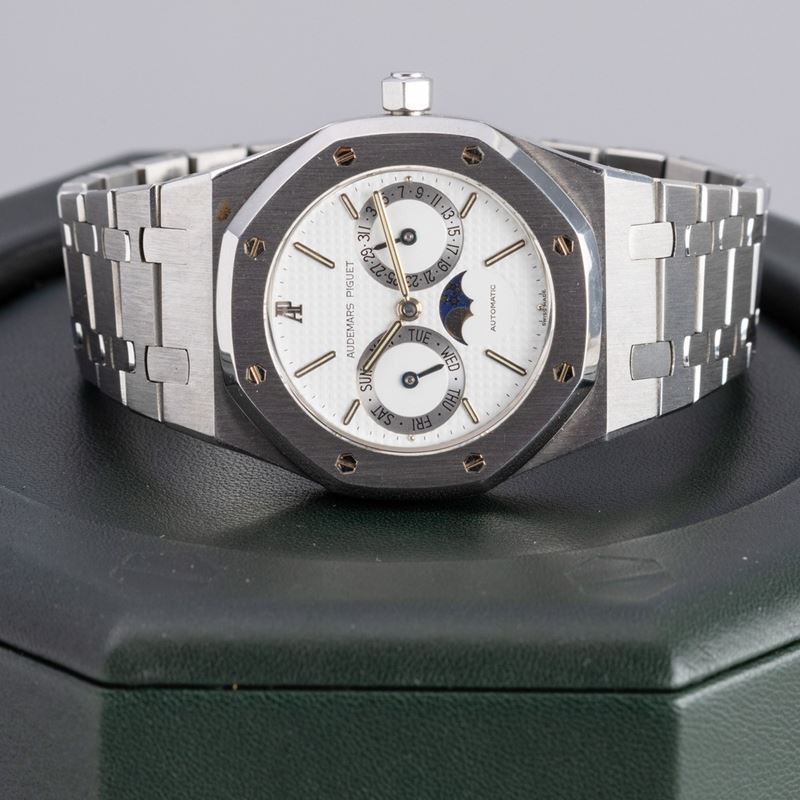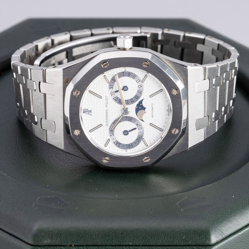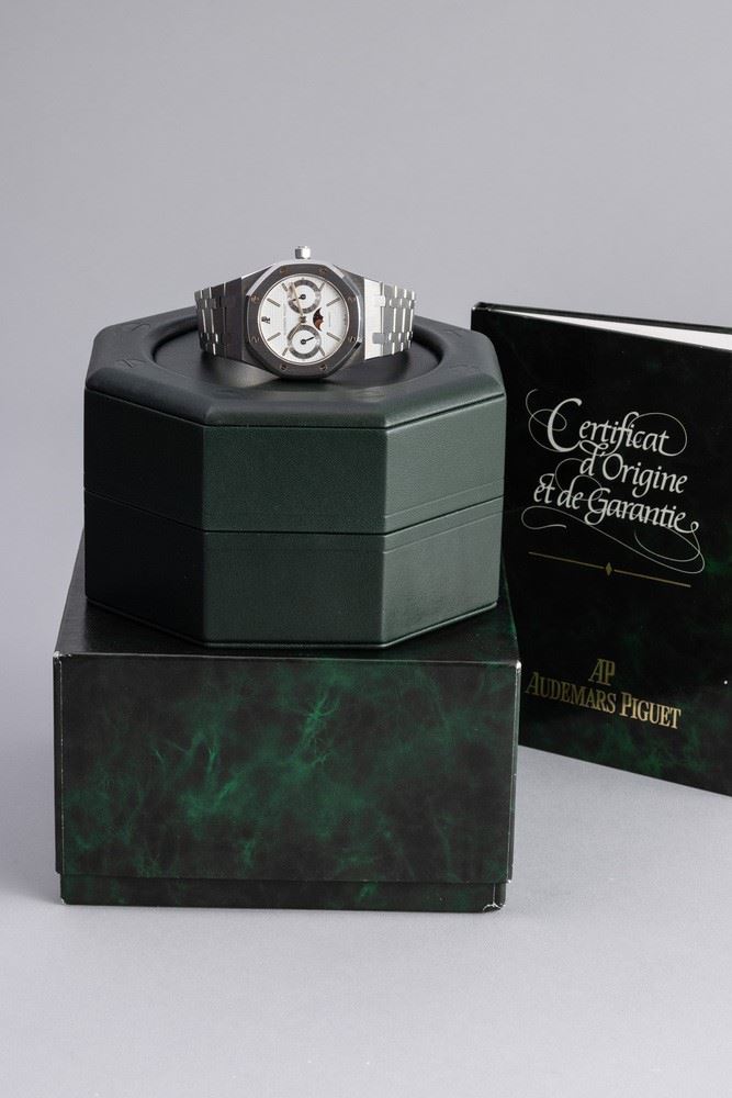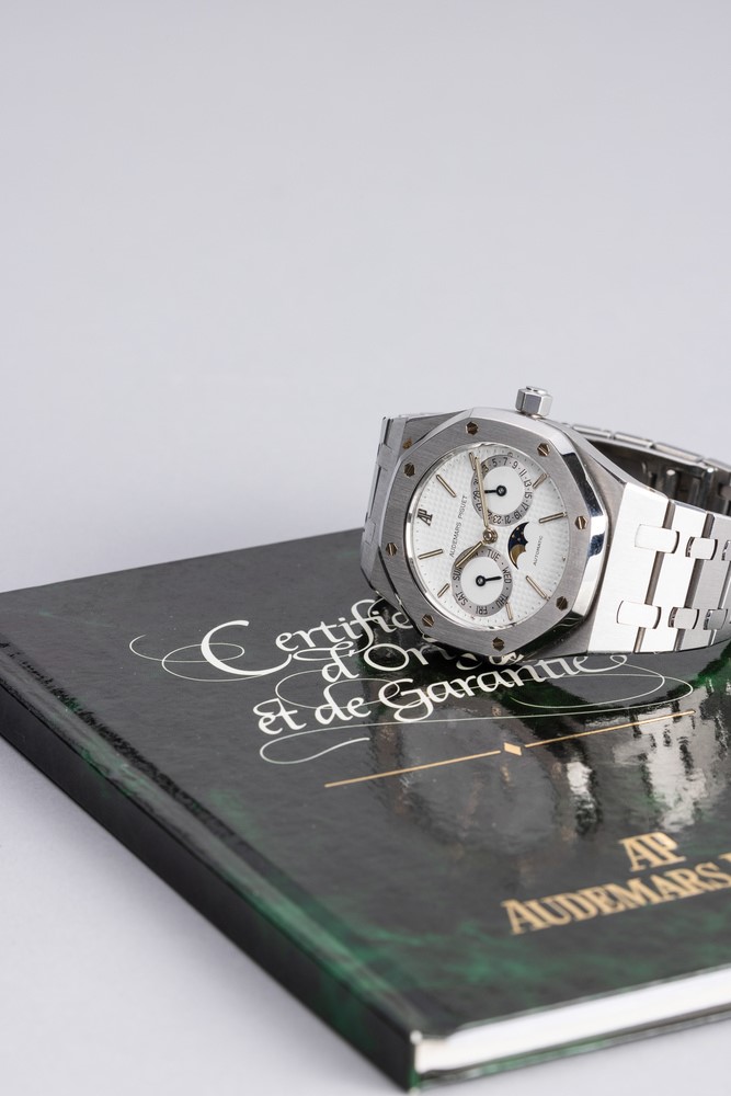 Sportivo ed elegante Royal Oak Day-Date con fasi lunari, automatico quadrante bianco petit Tapisserie con indici a bastone, completo di scatola e garanzia