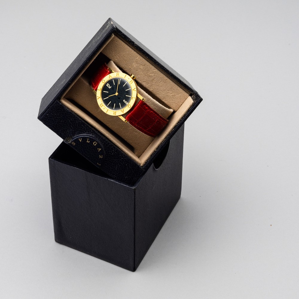 Fine ed elegante, Bulgari, orologio da polso Lady in oro giallo, quadrante nero e movimento al quarzo