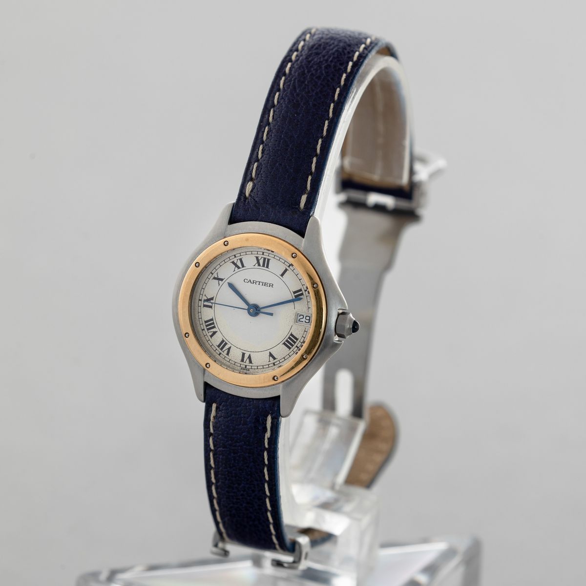 Cartier Rondè in acciaio e oro giallo 18k, quadrante bianco con datario e numeri romani, movimento al quarzo, cinturino in pelle