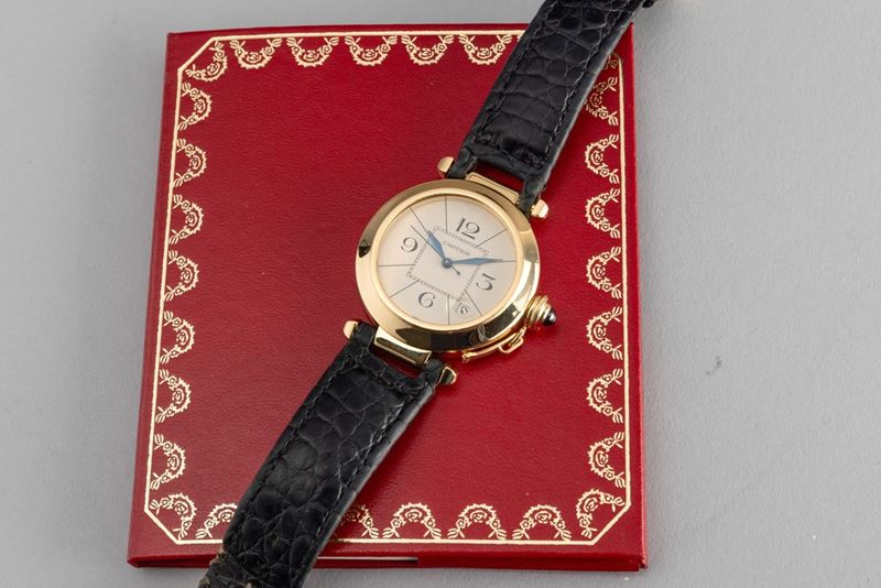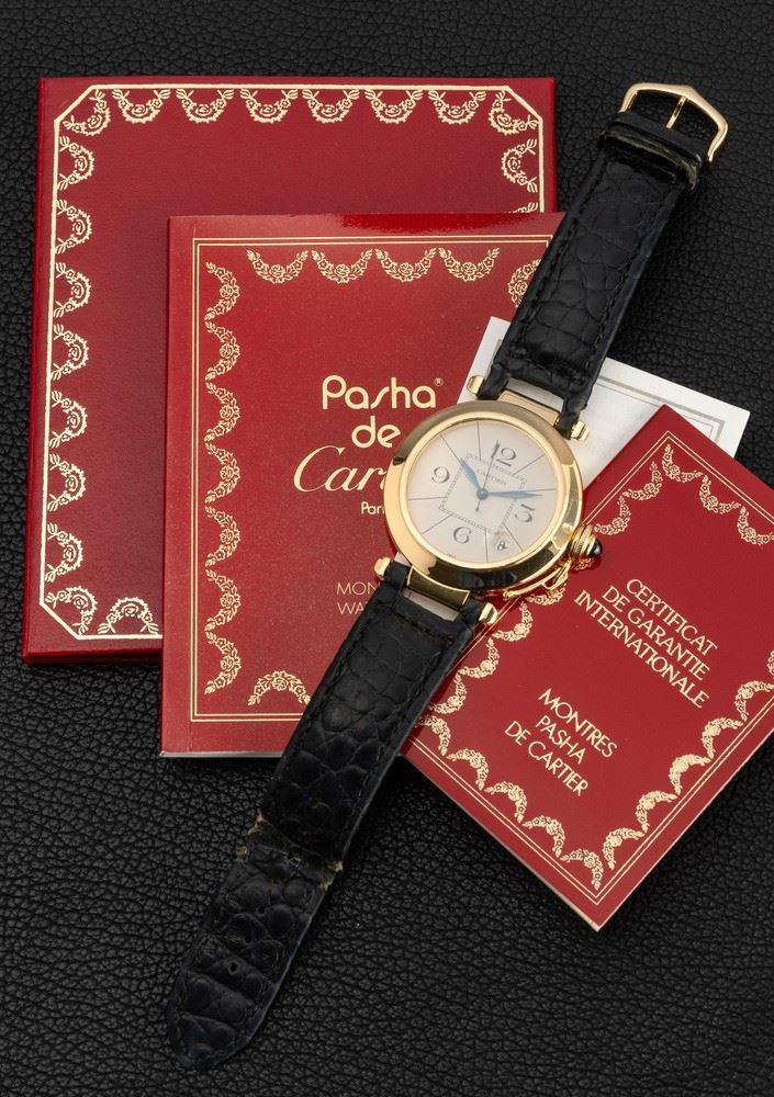 Classico Pashà in oro giallo 18k, quadrante argentato Grenè numeri Arabi, secondi centrali e lancette a foglia, movimento automatico con datario