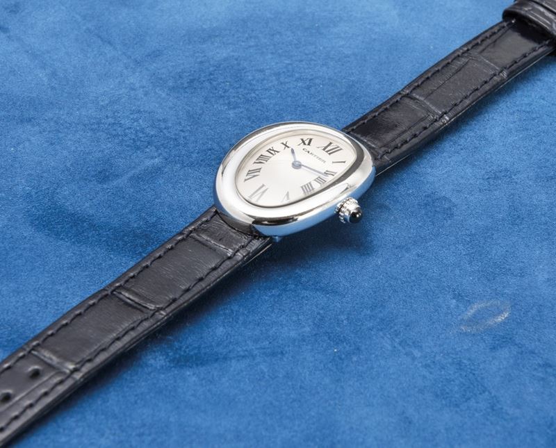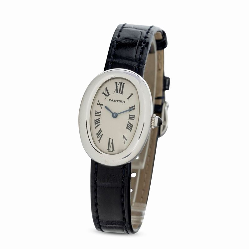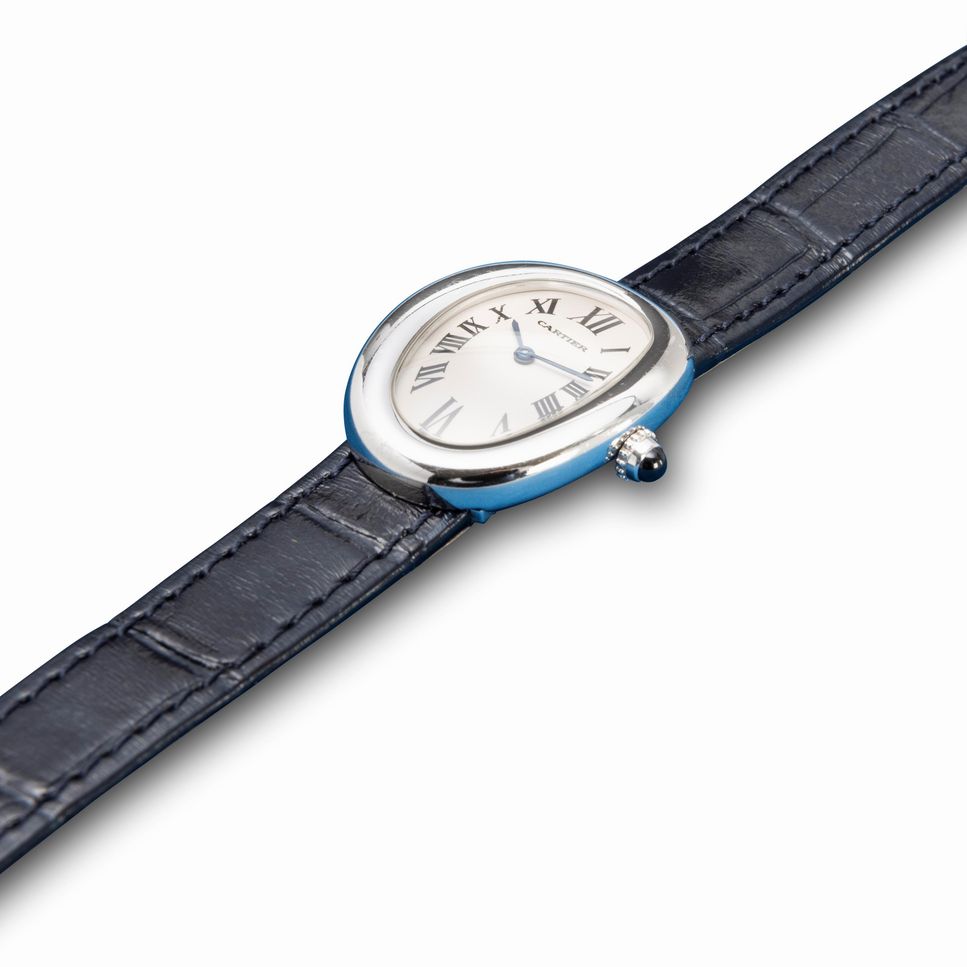 Elegante Bagnoire in oro bianco 18k di forma ellittica e curva con numeri Romani esplosi su quadrante Argentè, cinturino in pelle e caboucon su corona di carica