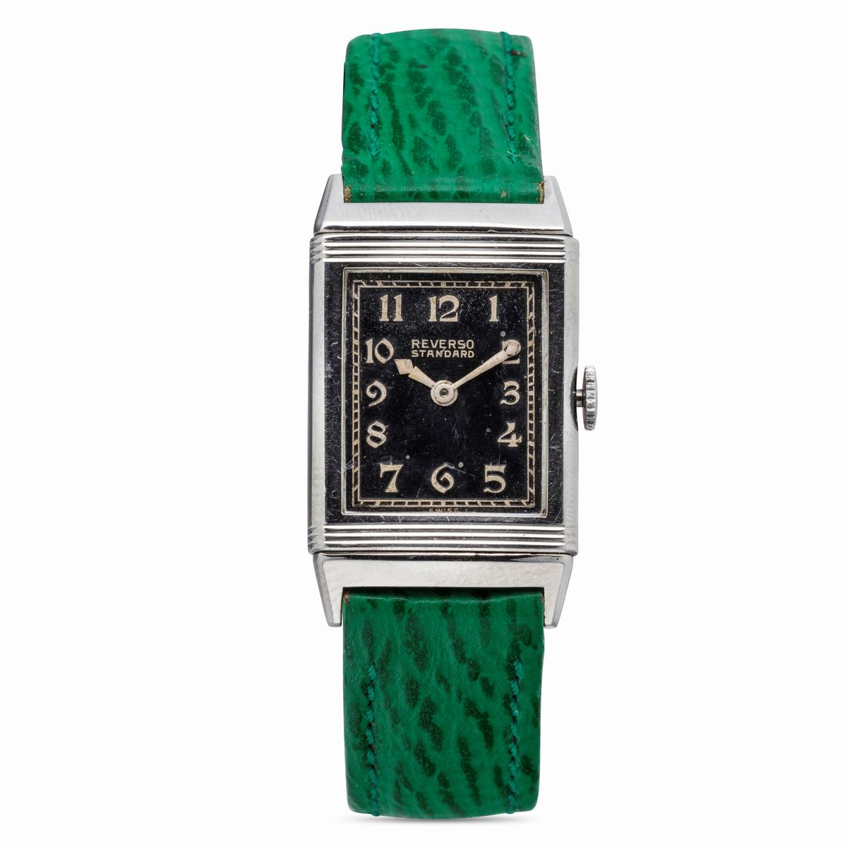Raro e iconico Reverso Standard in acciaio Staybright, quadrante nero con numeri Decò in rilievo e minuteria Chemin De Fer, [..]