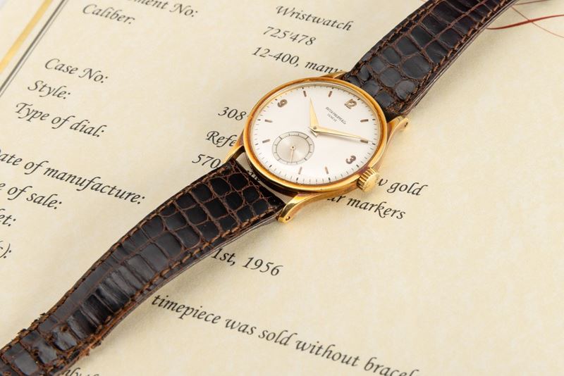 Elegante Calatrava ref 570 J in oro giallo 18k quadrante Argentè con numeri Arabi applicati e secondi al sei, accompagnato da estratto d'archivio