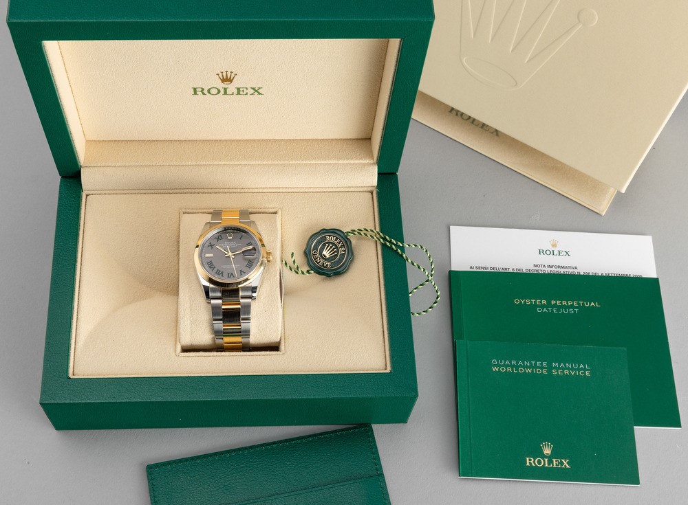 Datejust Wimbledon, ref 126203, in acciaio e oro giallo 18k con quadrante ardesia e numeri Romani verdi, bracciale Oyster bicolore