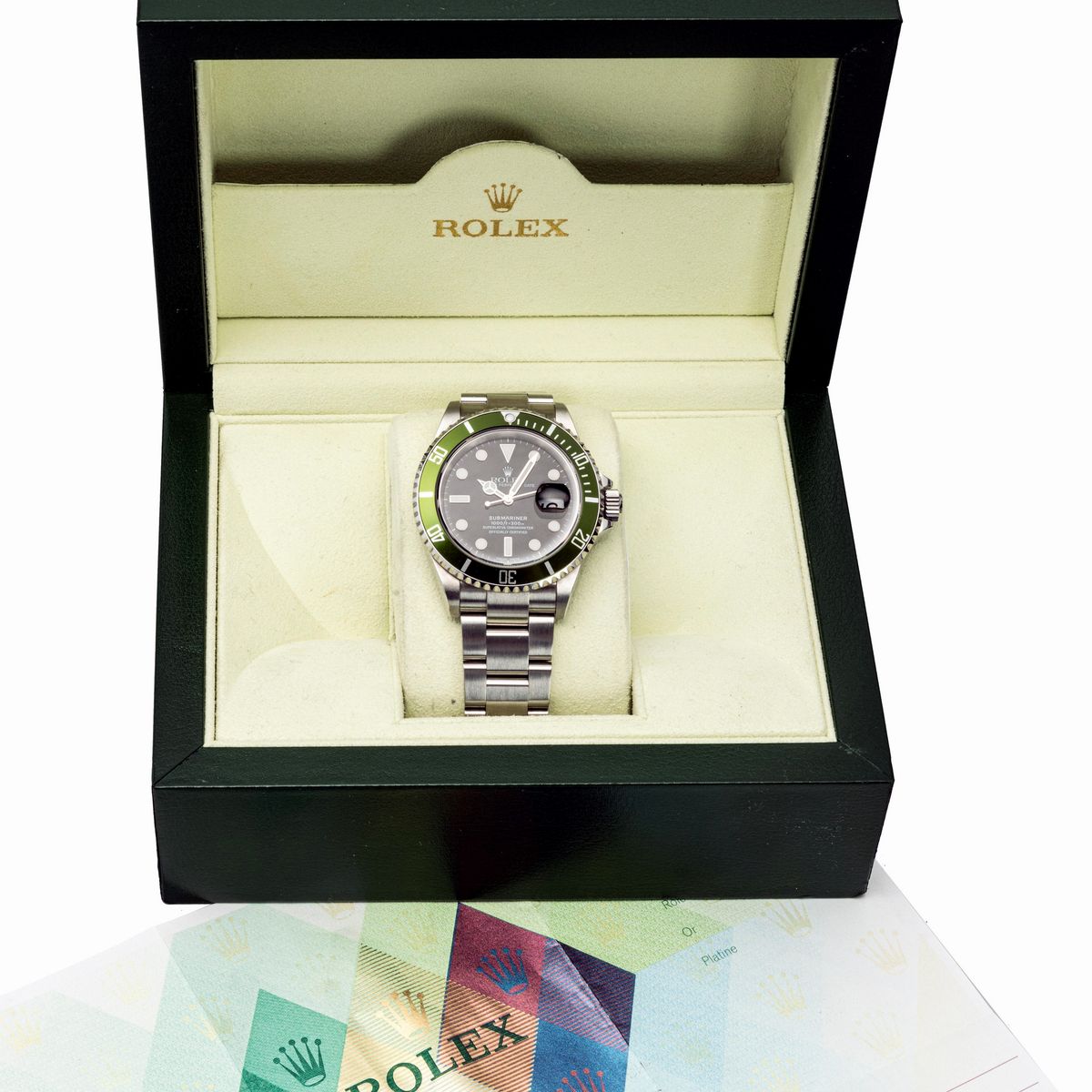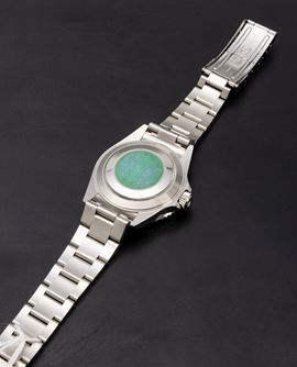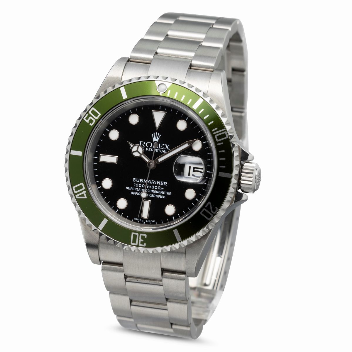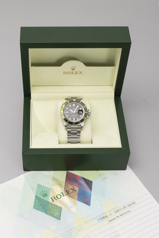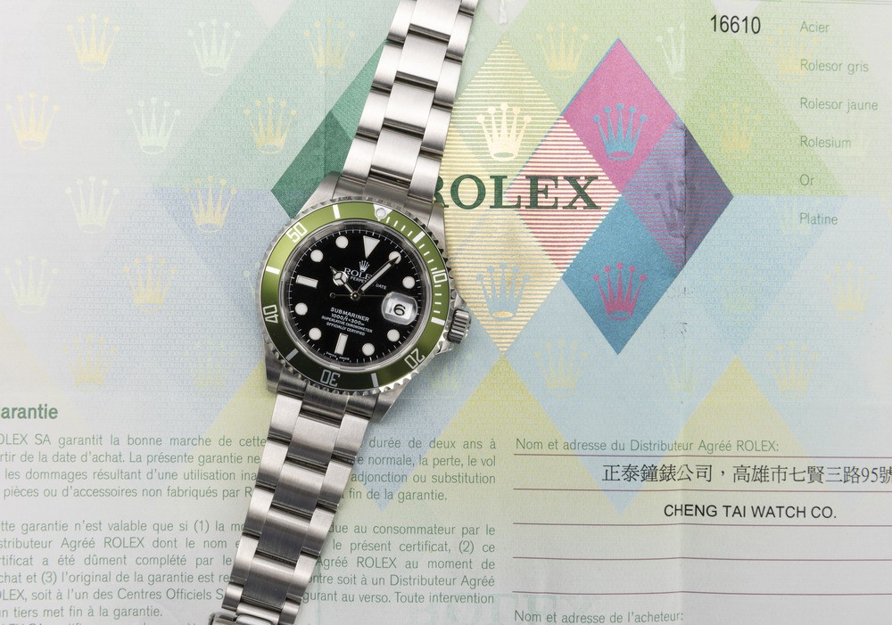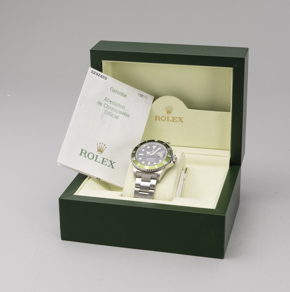 In occasione del 50° anniversario del pionieristico orologio subacqueo della Maison Rolex, il Submariner, la ref. 16610LV diventa presto un classico di culto grazie all'accattivante inserto della lunetta in alluminio verde e al quadrante Maxi con indici e lancette più grandi.