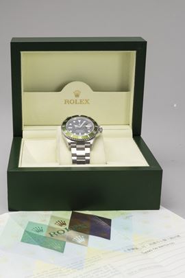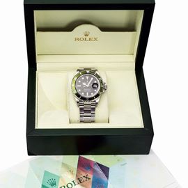 Iconico e sportivo Submariner 16610 LV del 50° anniversario, con ghiera girevole verde, in acciaio inossidabile con quadrante nero e bollino sul fondello, accompagnato da scatola e garanzia
