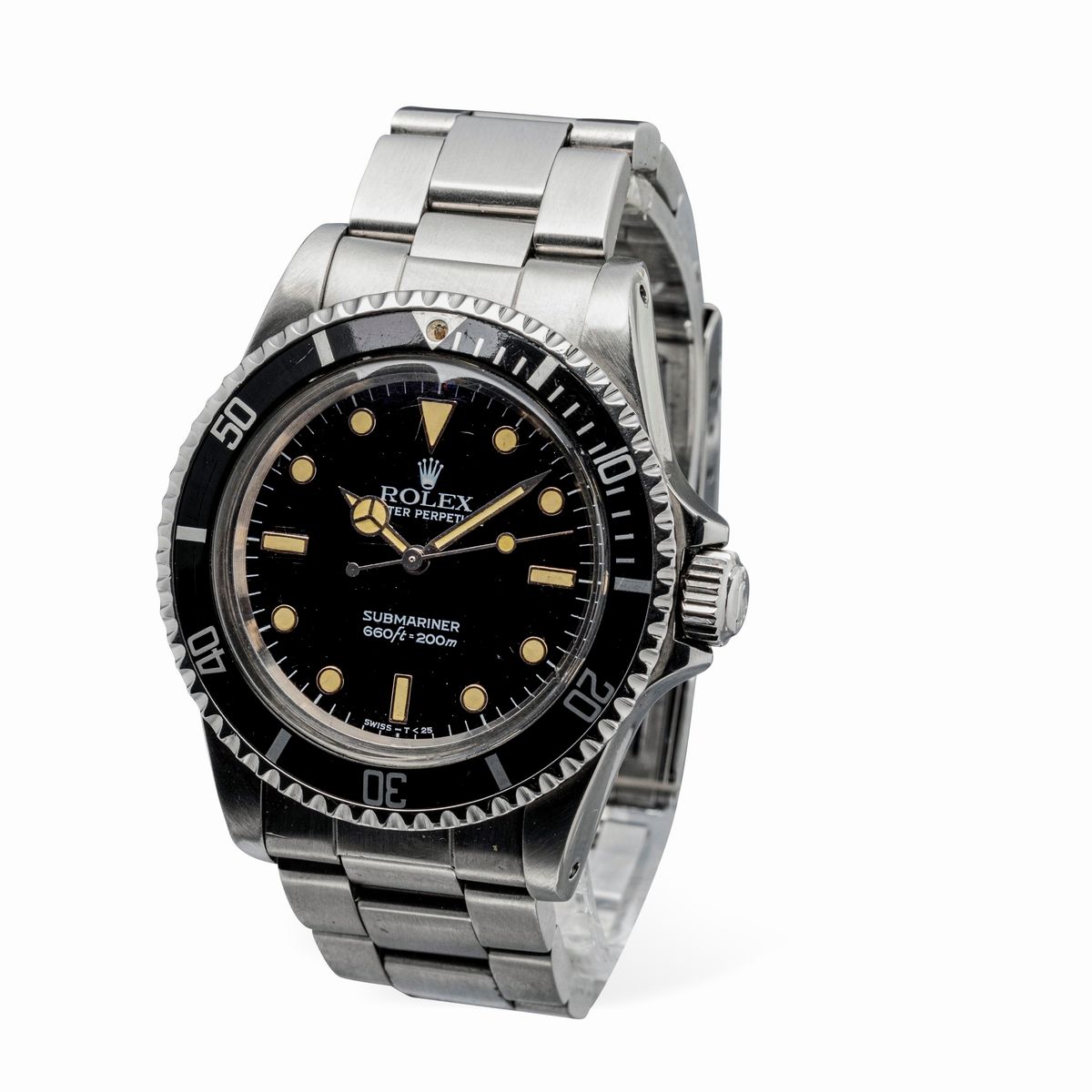 Iconico Submariner ref 5513 in acciaio inossidabile transizionale con vetro plastica e quadrante nero lucido "Bicchierini", movimento automatico e bracciale Oyster
