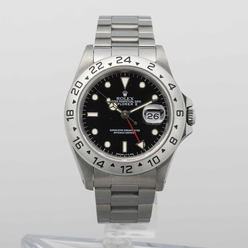 Sportivo e leggendario Explorer II ref 16570 in acciaio inossidabile, automatico con datario e indicazione delle 24 ore sulla ghiera, quadrante nero luminescenza al trizio
