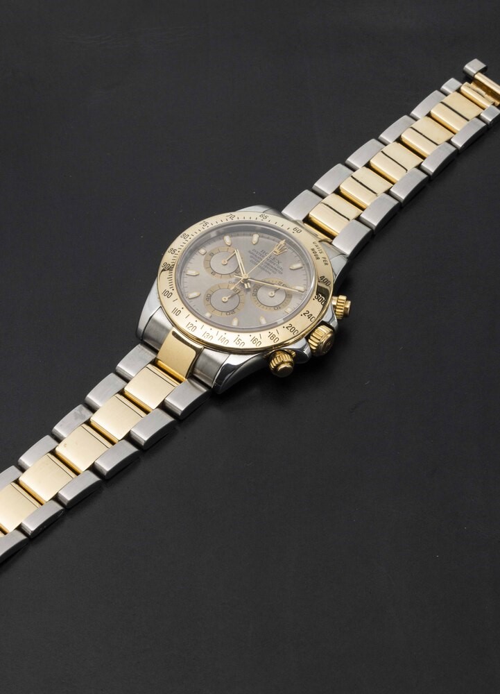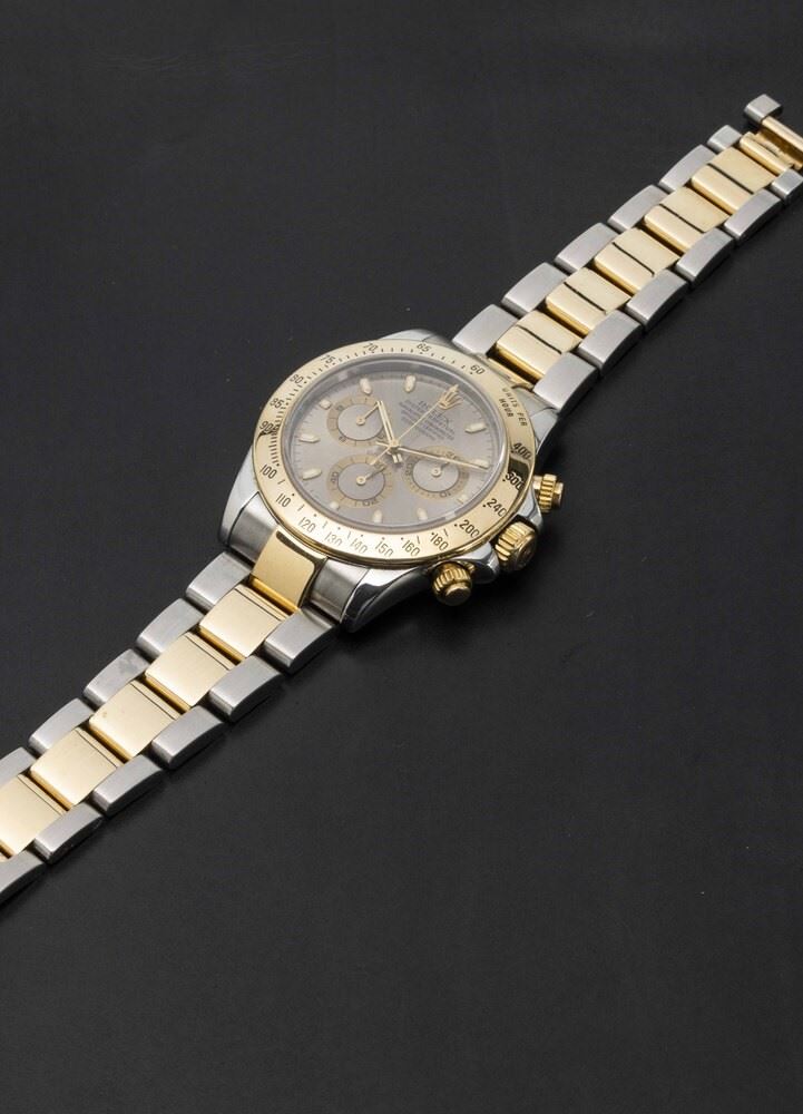 Sportivo ed iconico Cosmograph Daytona ref 116523, acciaio e oro giallo quadrante grigio ardesia, movimento automatico, ghiera graduata tachimetrica e bracciale Oyster
