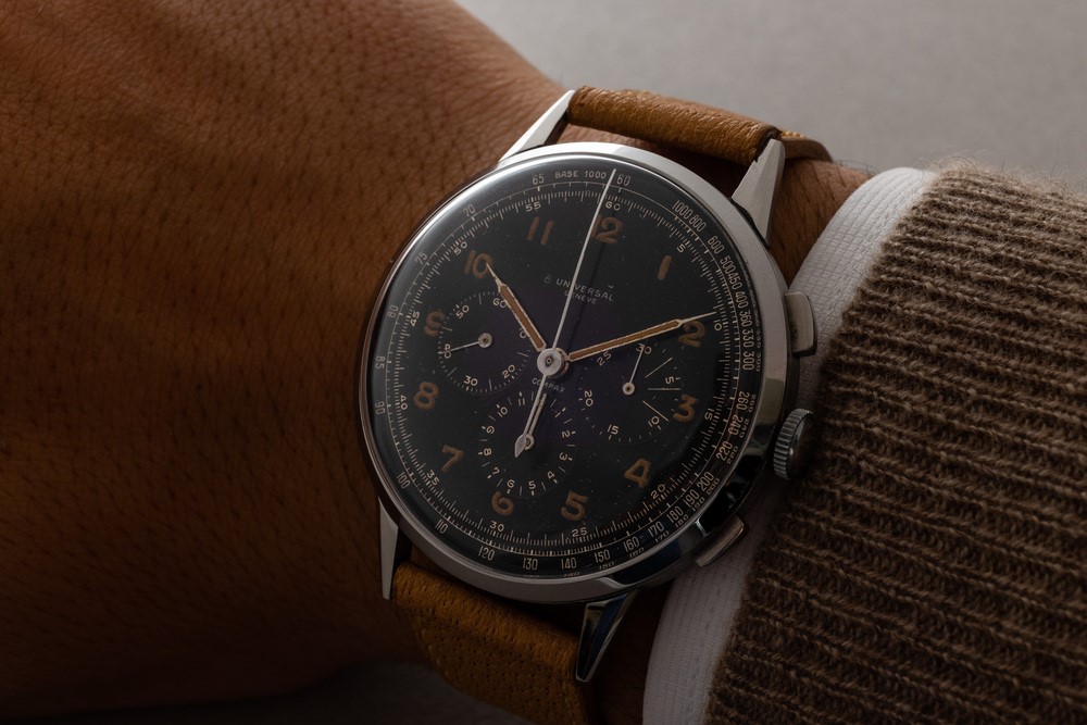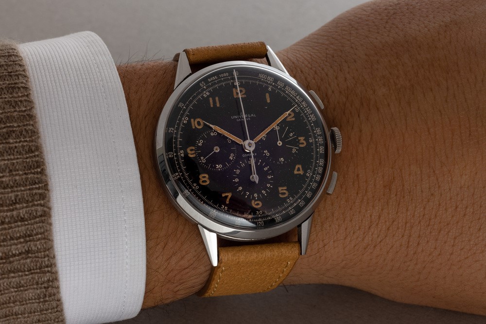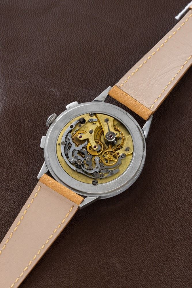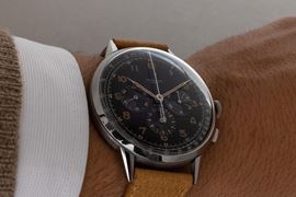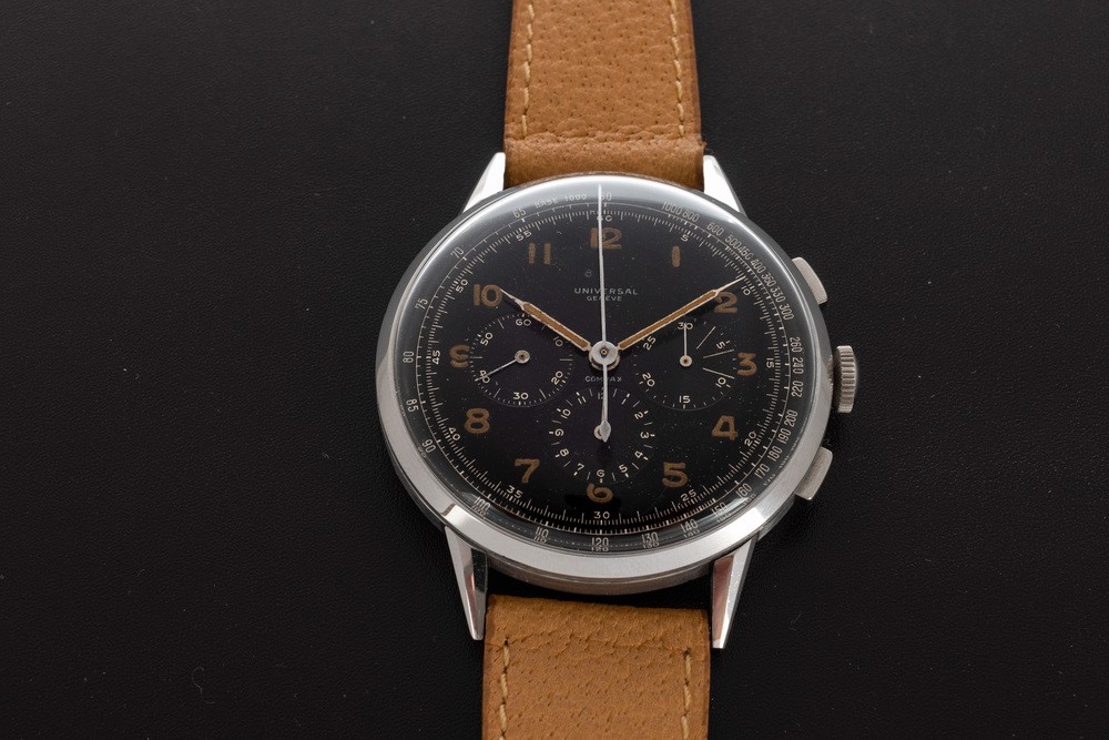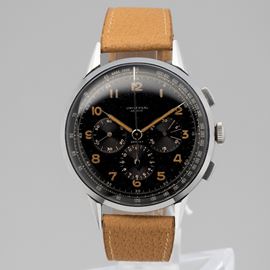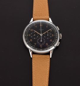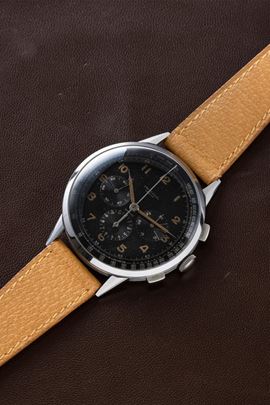 Raro ed affascinante cronografo Compax fuori misura in acciaio, quadrante laccato nero con numeri Arabi al radio, anni '4 [..]