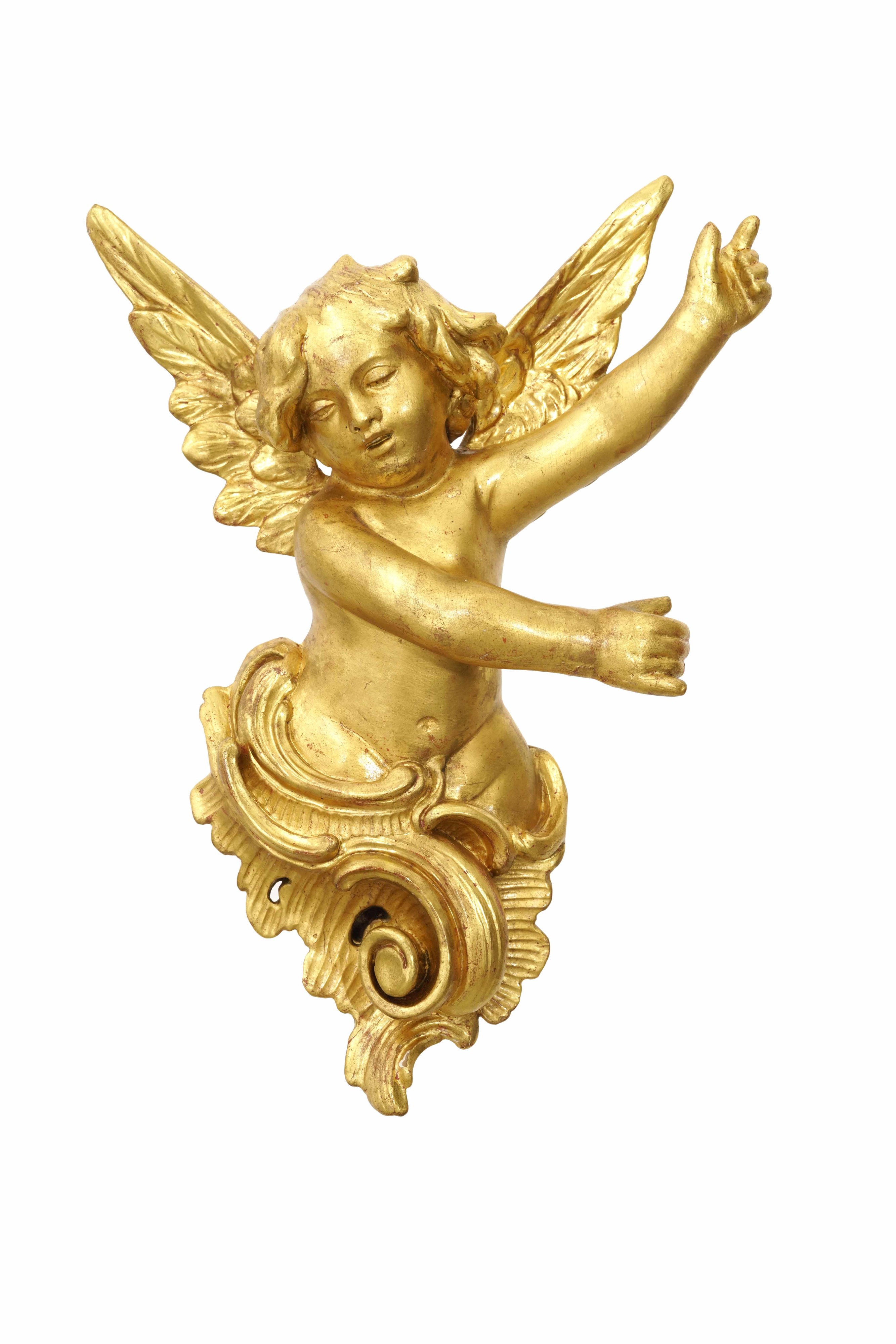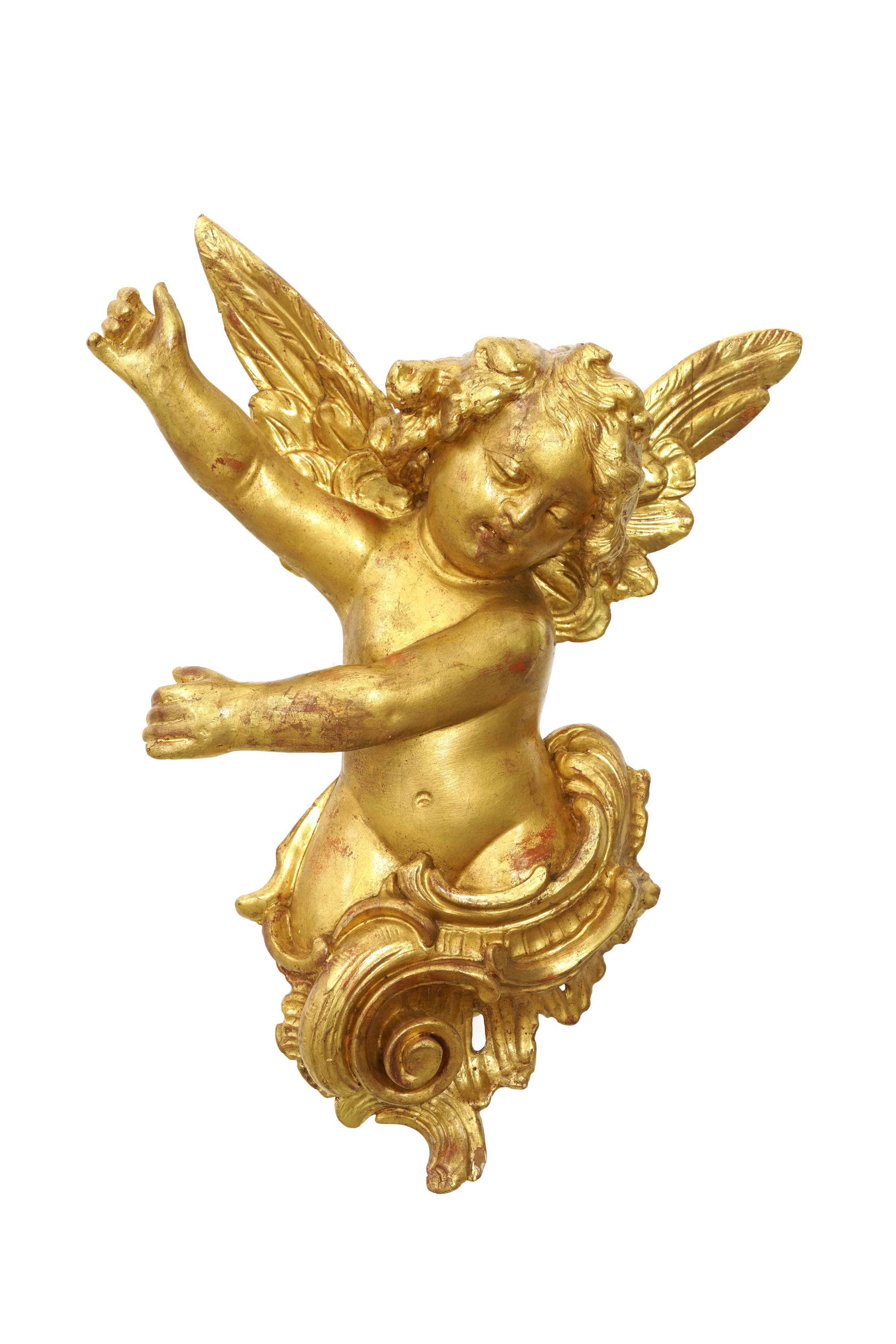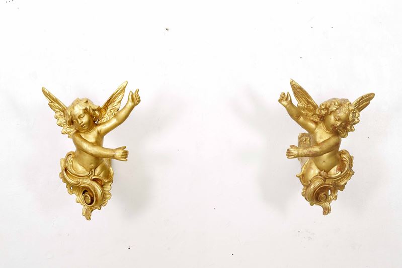 Coppia di fermaporta in legno intagliato e dorato con cherubini. XIX secolo