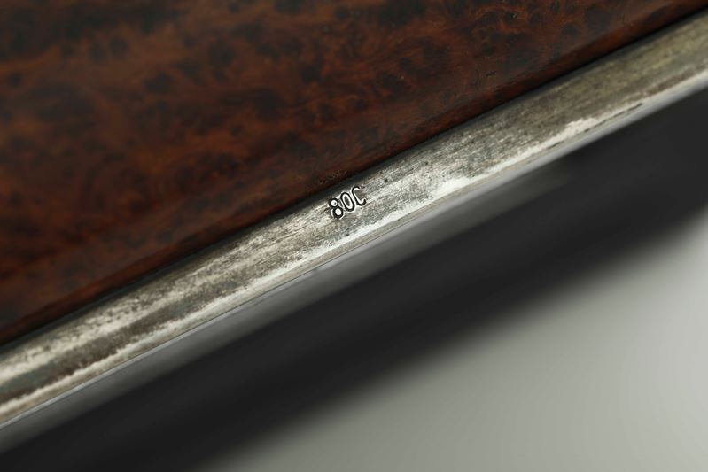 Pendola da tavolo Art Decò in radica e argento. XX secolo