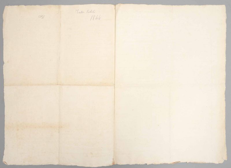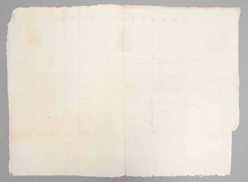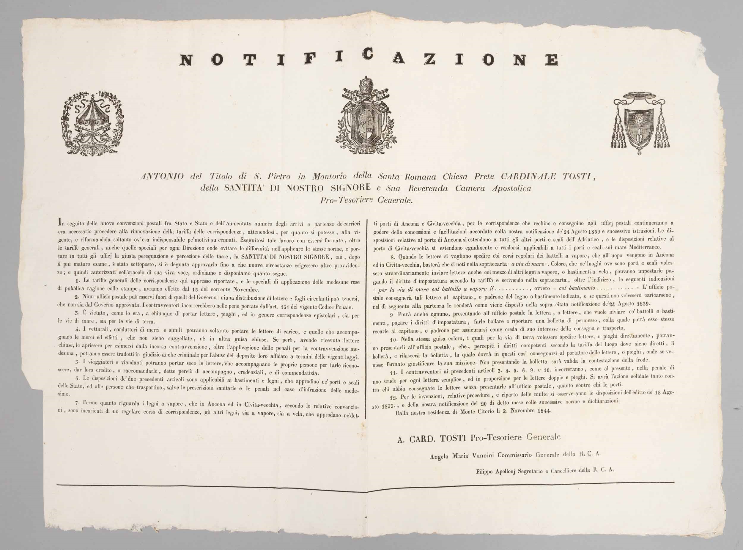 Pubblicato a Roma il 2 novembre 1844 dal Cardinale Tosti, con le istitruzioni generali sul trattamento della corrispondenza e le tariffe via di terra e di mare, per tutte le destinazioni. Importante documento pontificio (cm 57 x 75). In ottimo stato.