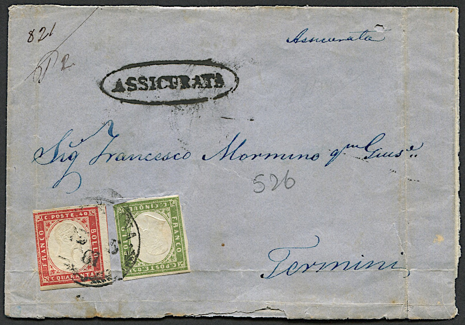 Affrancata con 5 e 40 cent. di Sardegna in tariffa di 20 centesimi per doppio porto più il diritto fisso di raccomandazione di 25 centesimi. Rara affrancatura, primi giorni d’uso dei francobolli sardi in Sicilia. Esemplari non in perfette condizioni (S. 13Ba, 16D). Rara.