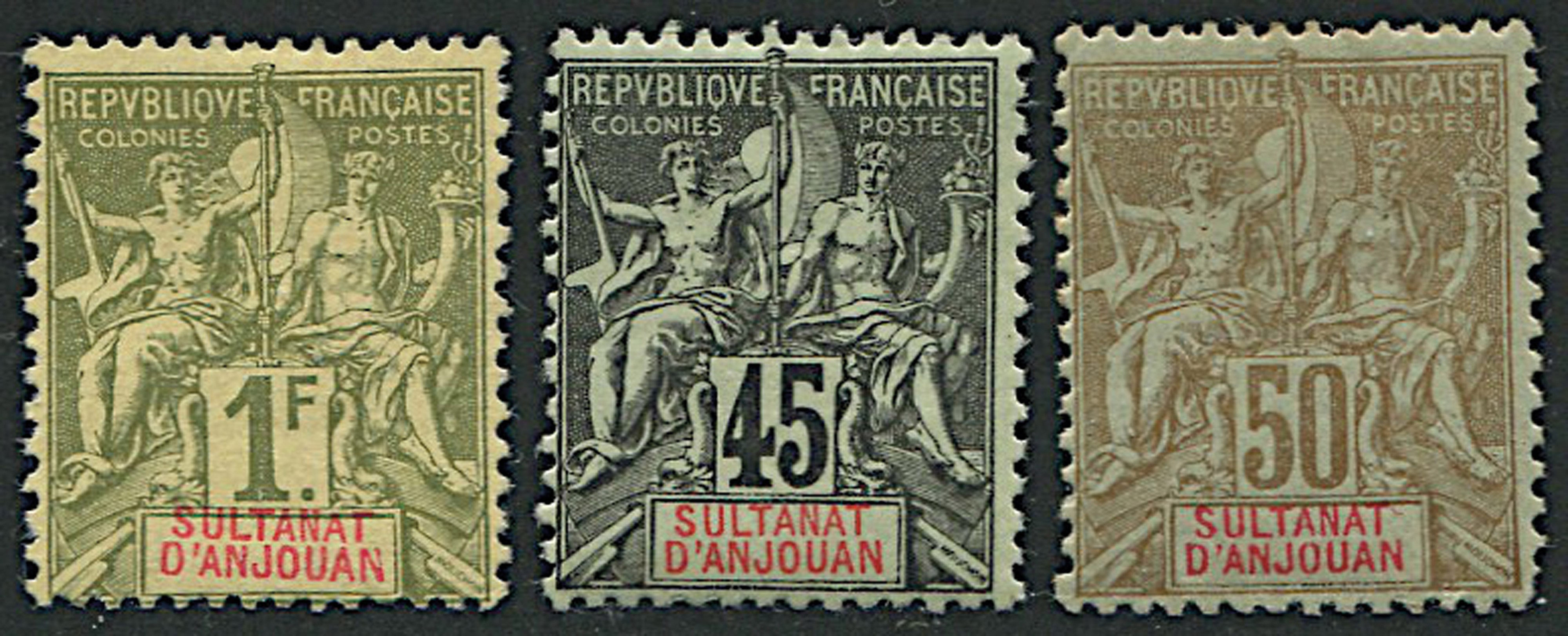New with part of original gum (Yv. 1/13) and 1900/07 issue 10 red, 15 grey, 35 black, 45 black-greeen, 50 brown (Yv. 1/13 + 14/15 - 17/19 – Scott 1/10 - 12/19)