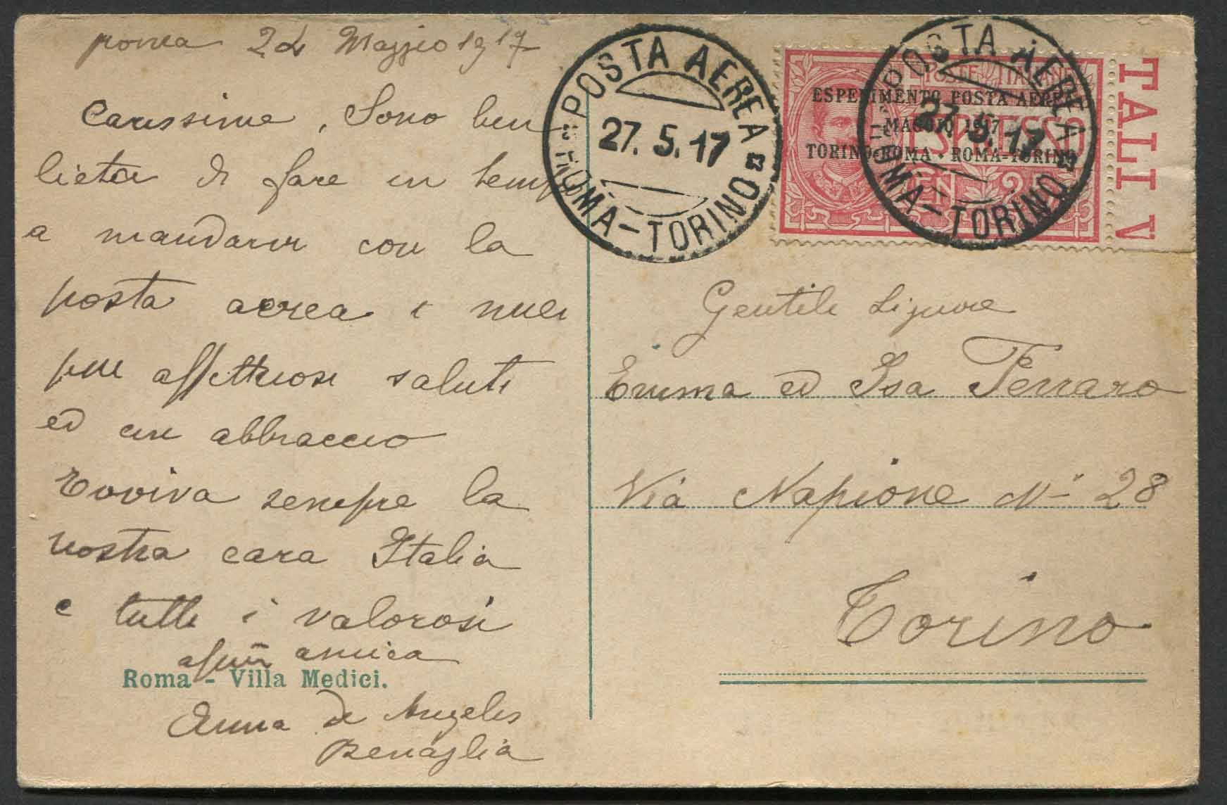 1917, Volo Postale Roma-Torino, cartolina non filatelica, da Roma per Torino del 25/07/1917