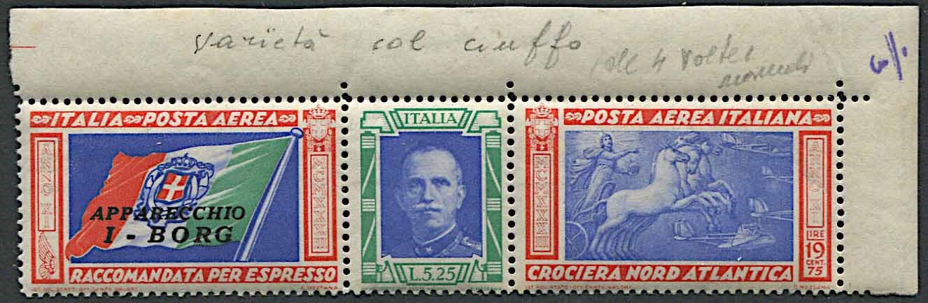 Trittico con soprastampa “I-Borg” (S. 51Da) con varietà “Ciuffo”. Gomma integra, perfetto. Certificato E. Diena.